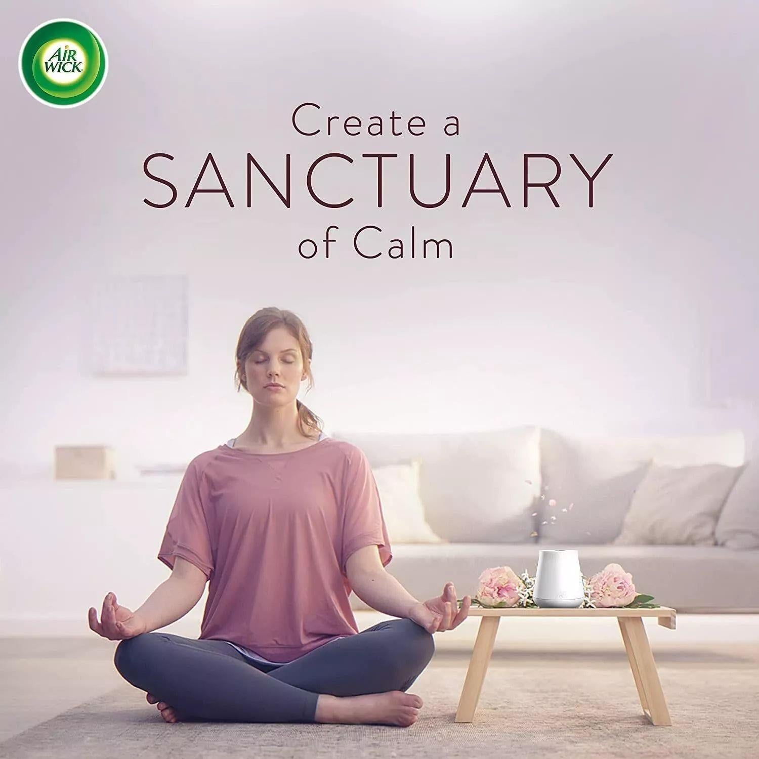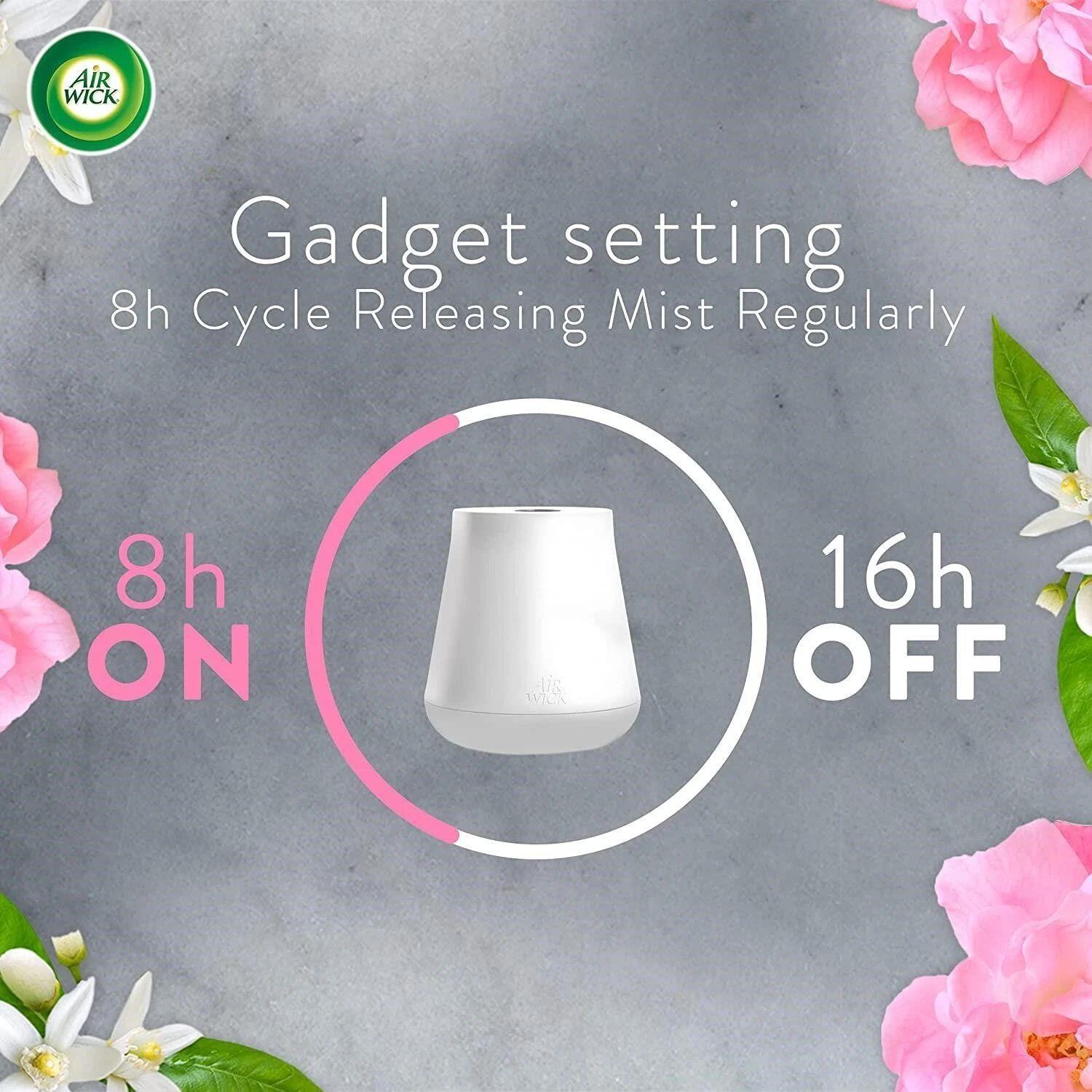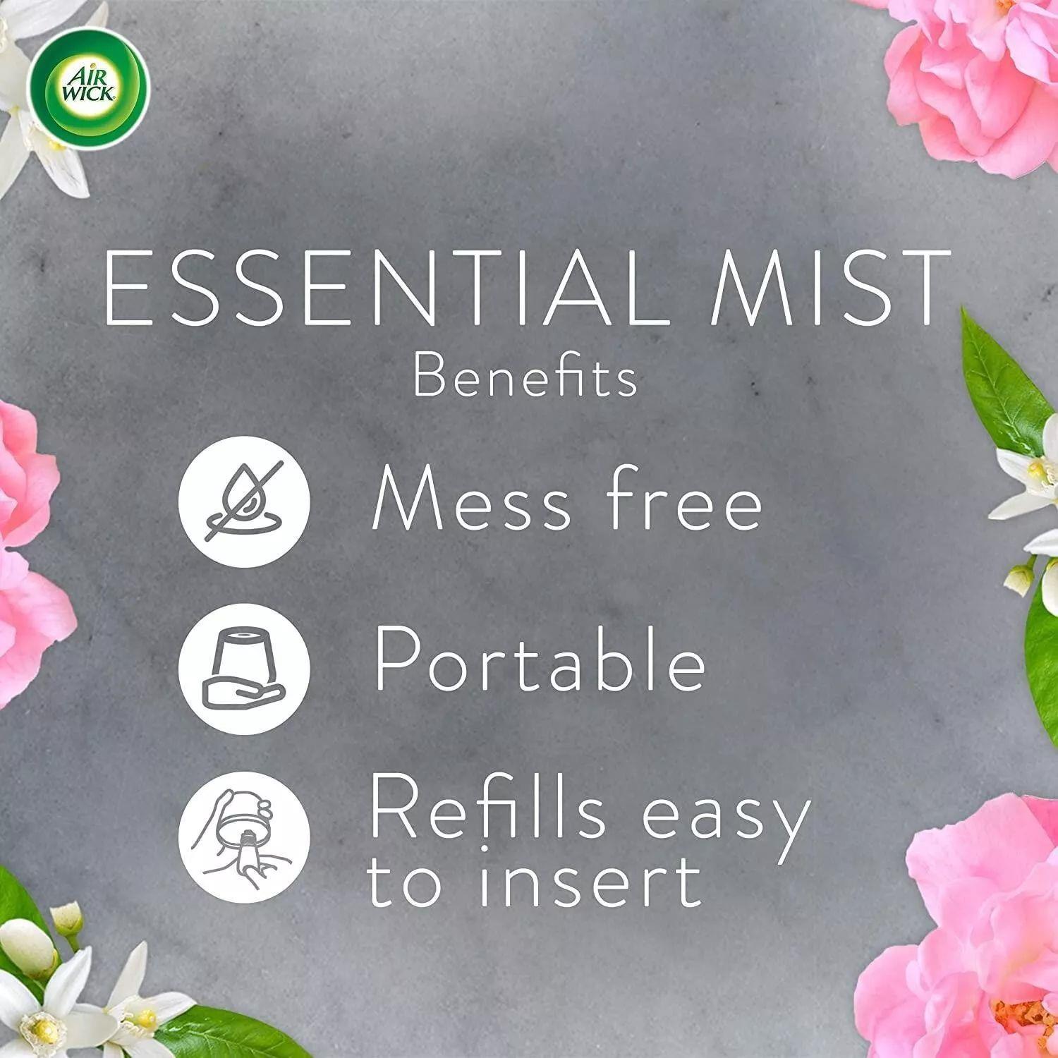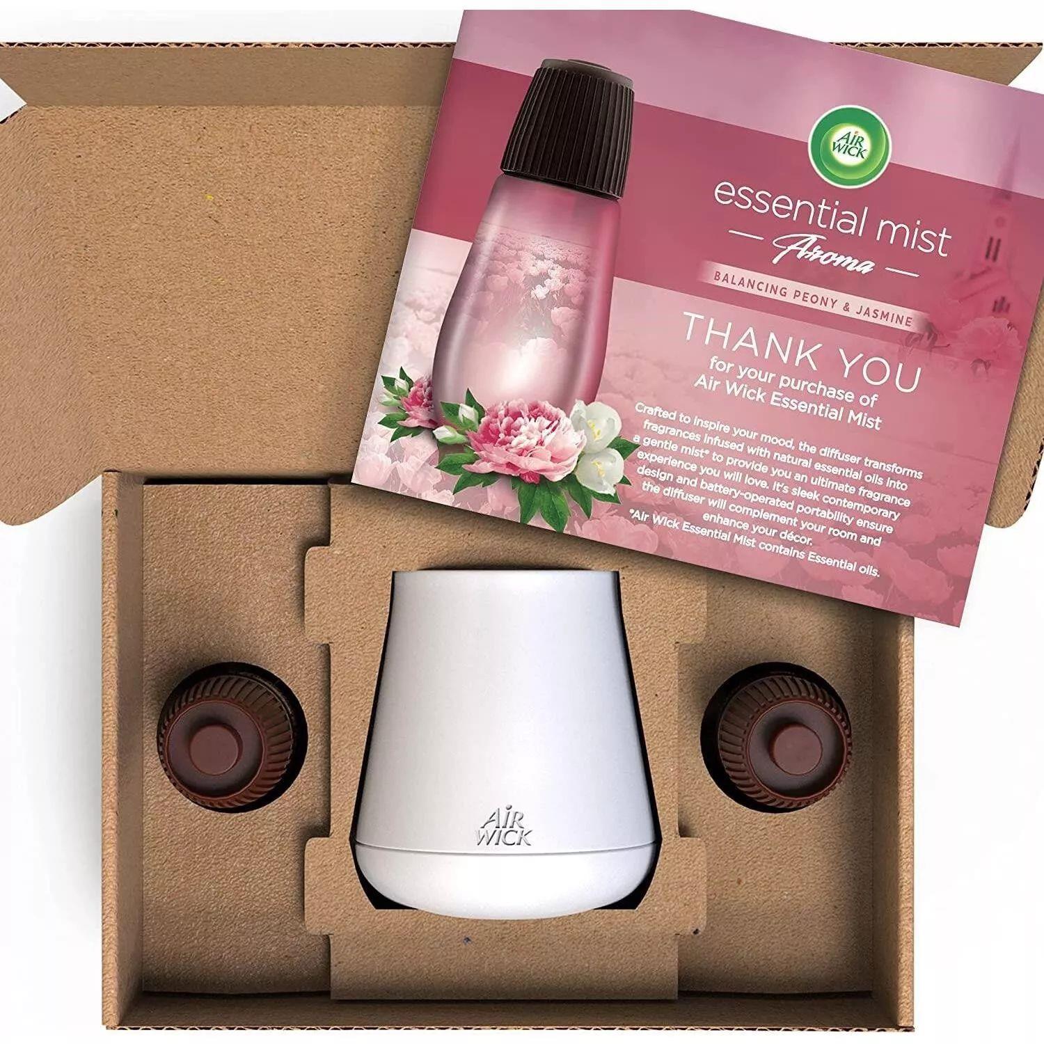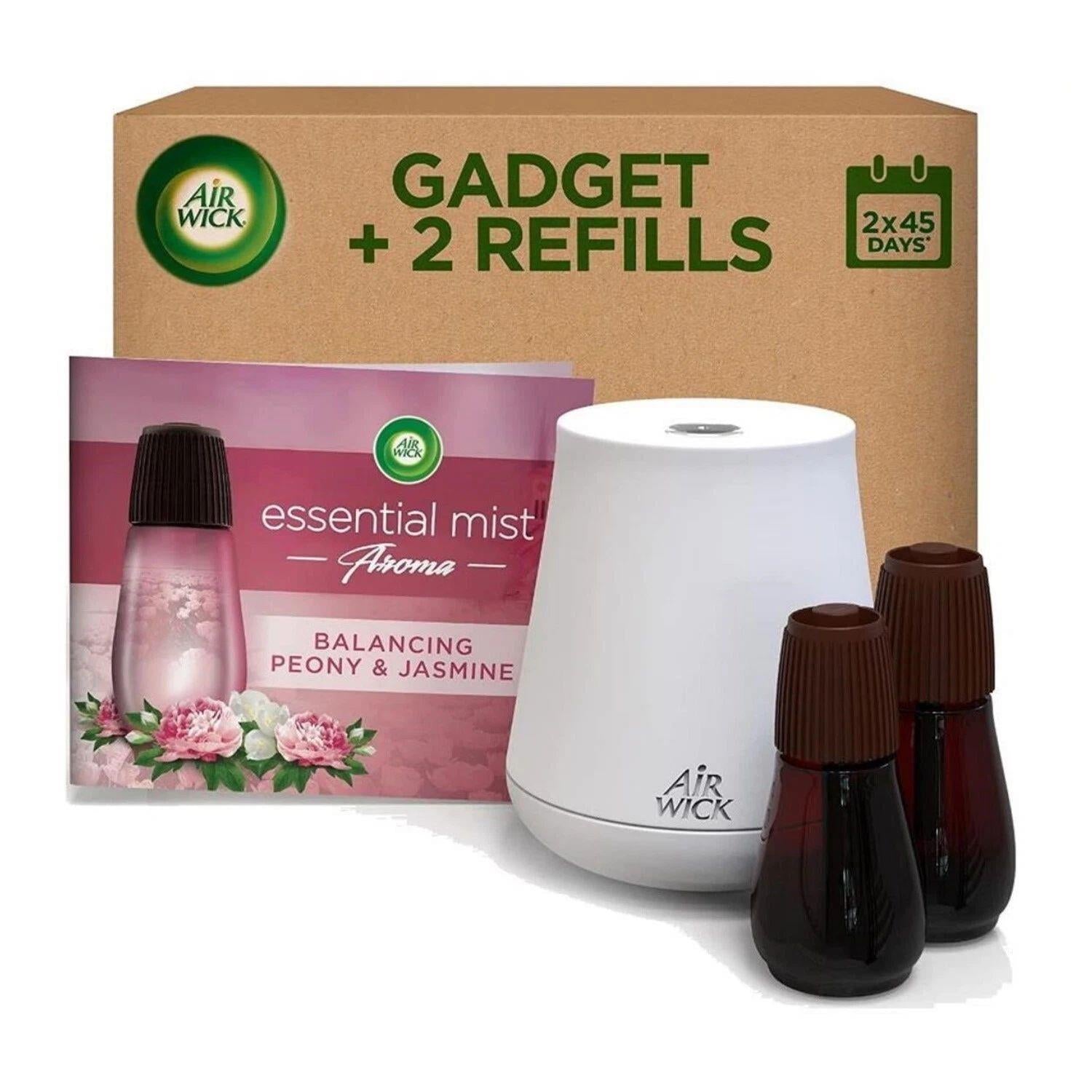 Transform your space with the Air Wick Essential Mist Kit, featuring the Balancing Peony & Jasmine fragrance. This bundle includes one elegant diffuser device and two 20ml essential oil-infused refills. The fine mist disperses a natural scent inspired by real essential oils, creating a calming and inviting atmosphere that lasts up to 45 days. Ideal for home or office environments.
