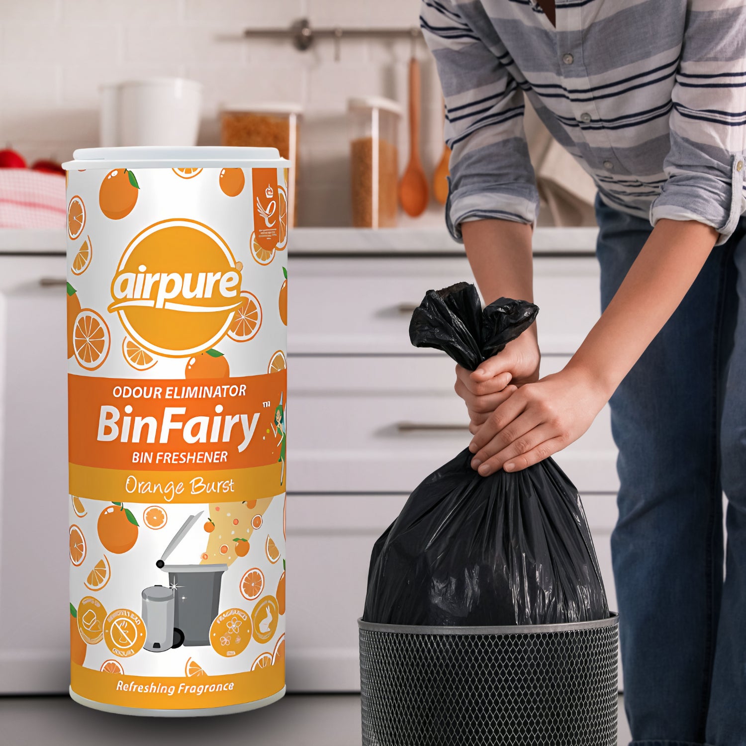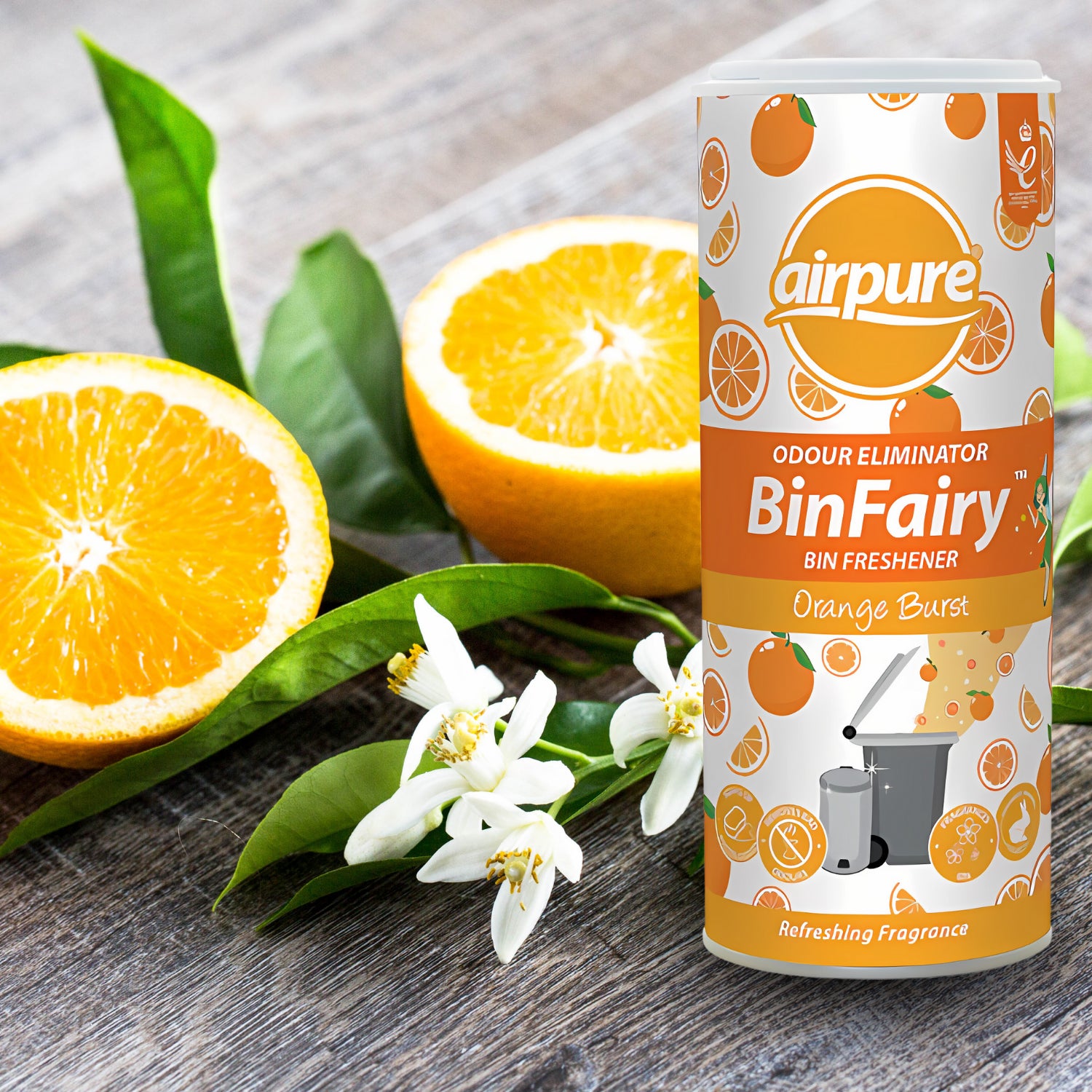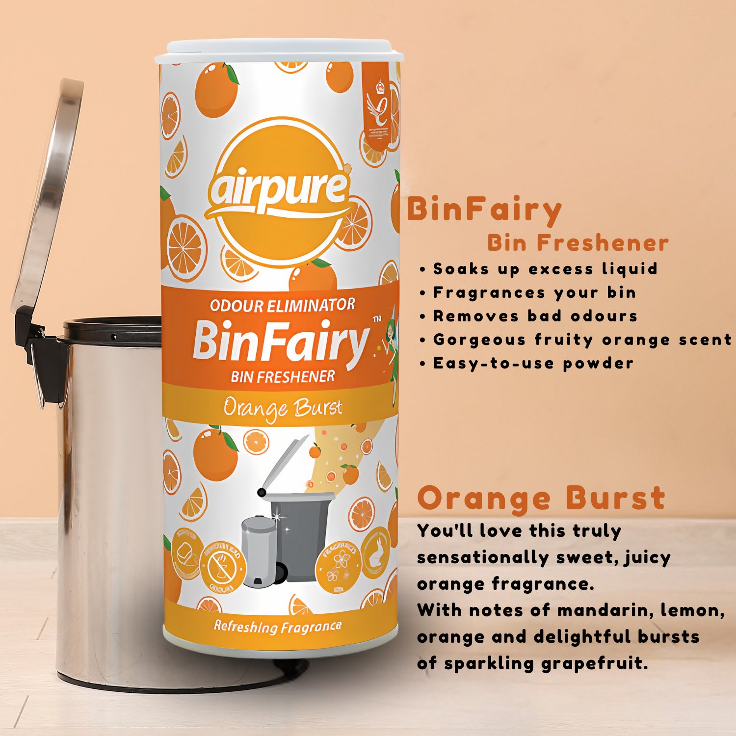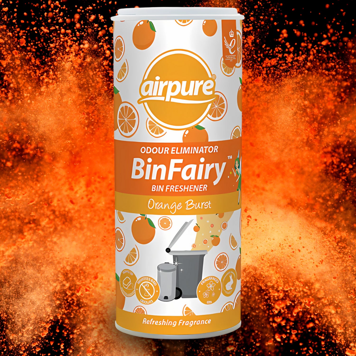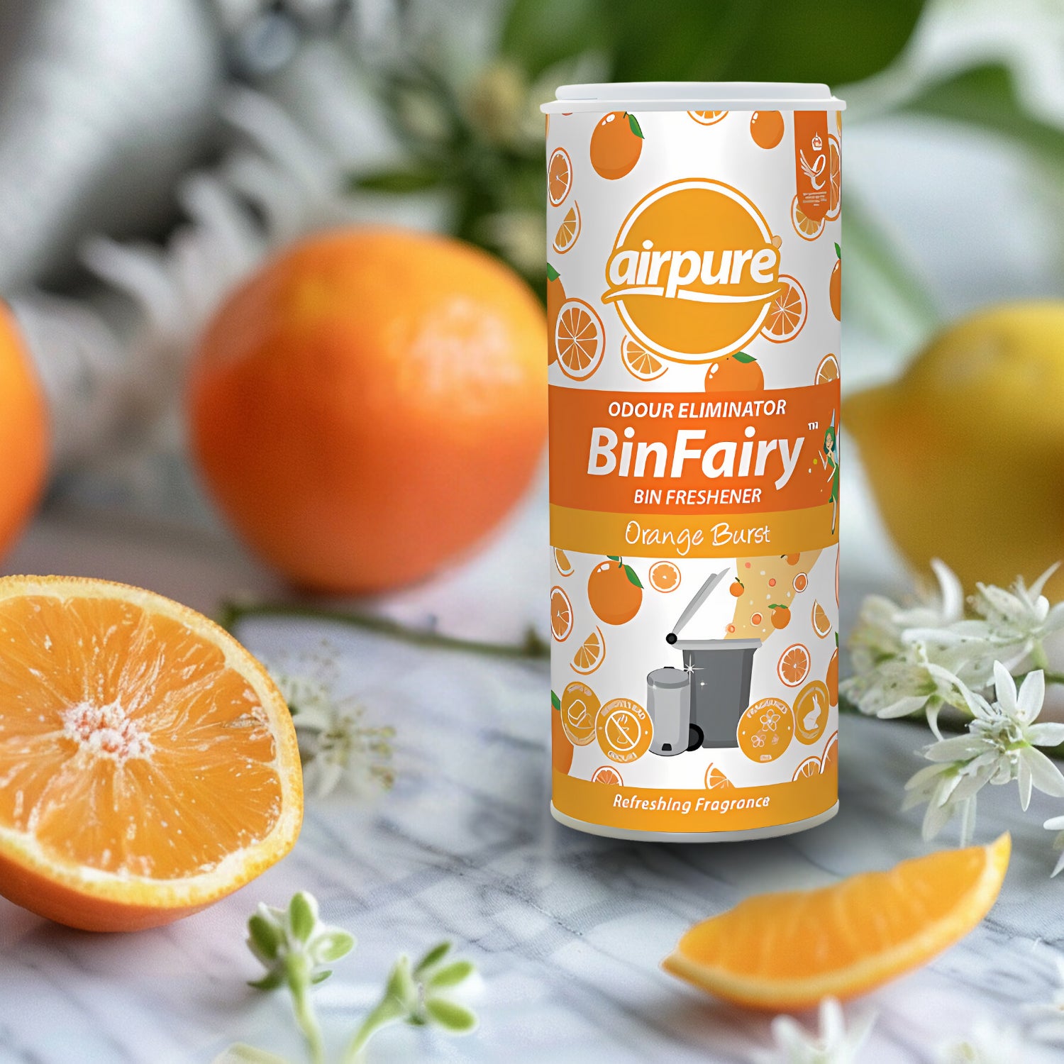 Airpure Bin Freshener Powder in a delightful Orange Burst fragrance—your magical solution for bin odor woes! This easy-to-use powder is designed to soak up excess liquids and eliminate bad odors, leaving your bin smelling fresh and fruity. With its super-absorbent formula, spills, leaks, and "bin juice" are no longer a concern. A quick sprinkle of this bin freshener works wonders, filling your bin with a burst of orange-scented freshness and banishing unpleasant smells for good. Perfect for keeping your bins clean, dry, and fragrant every day!