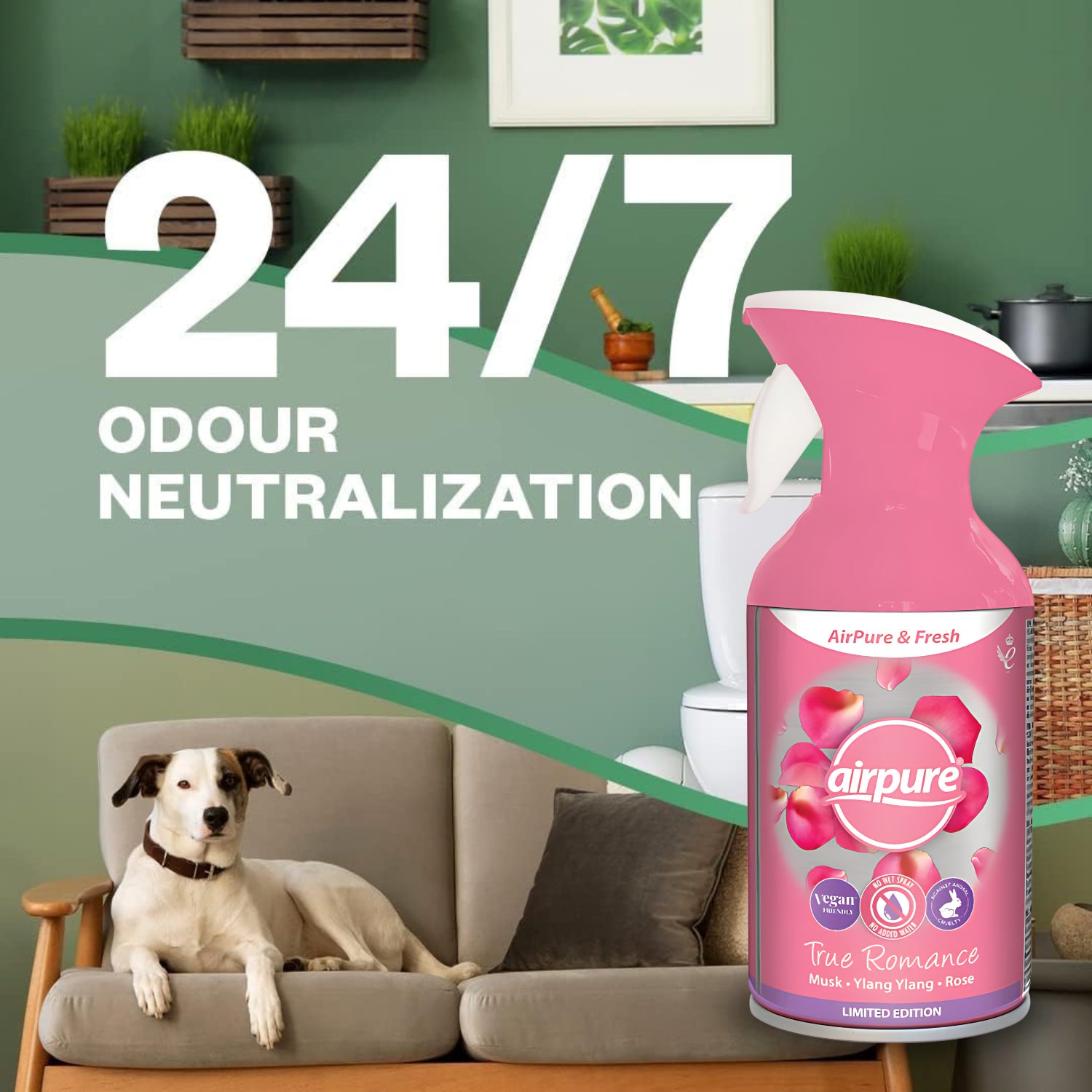 Airpure Fresh Home Room Air Freshener Spray, a powerful and long-lasting solution for keeping your home fresh and odor-free. This 250ml spray neutralizes unwanted odors with a quick burst of fragrance, leaving a clean and revitalizing scent in the air. Unlike traditional air fresheners, it delivers a dry spray with no added water, ensuring that it freshens your space without leaving any wet residue. Vegan-friendly and cruelty-free, this air freshener is perfect for use throughout your home whenever a room needs a quick refresh.