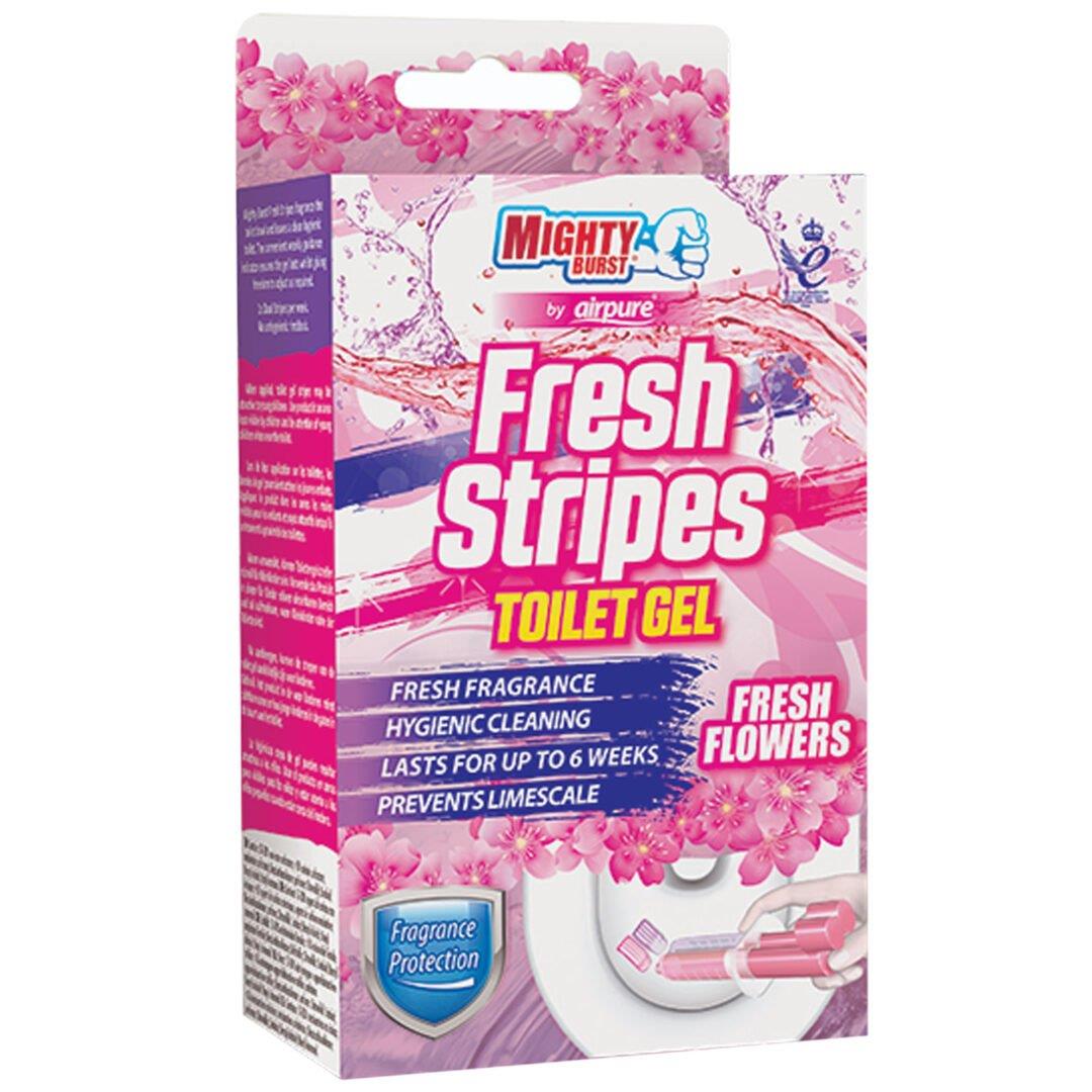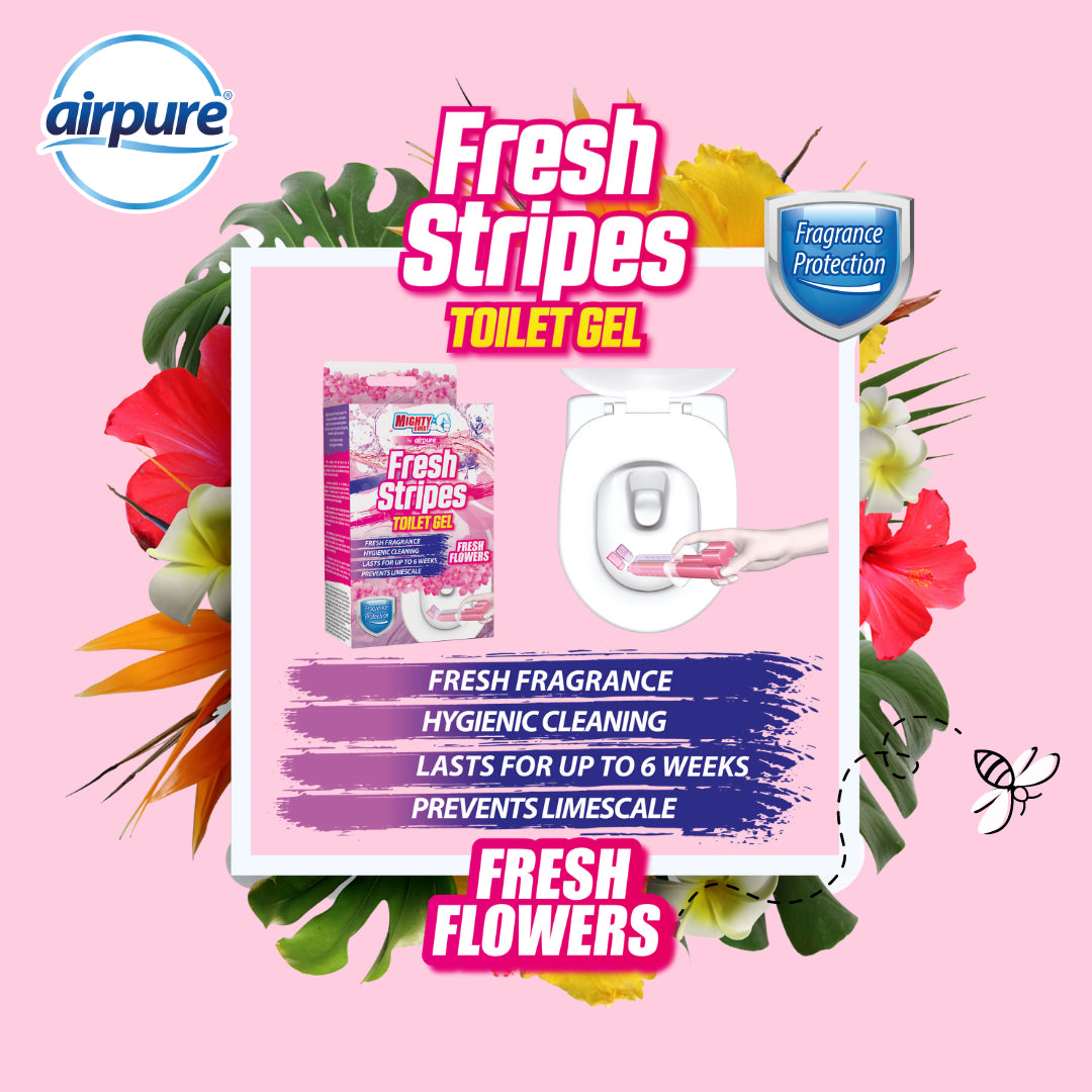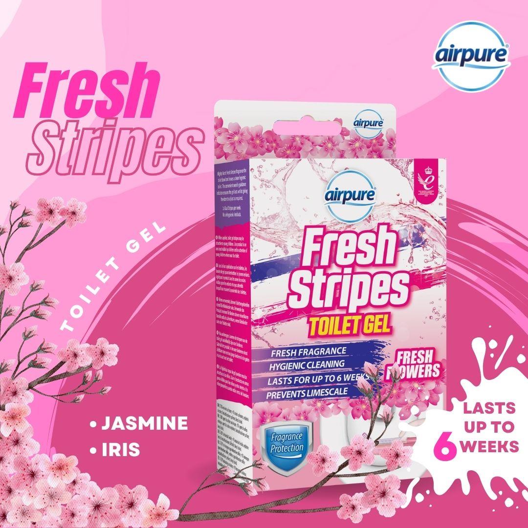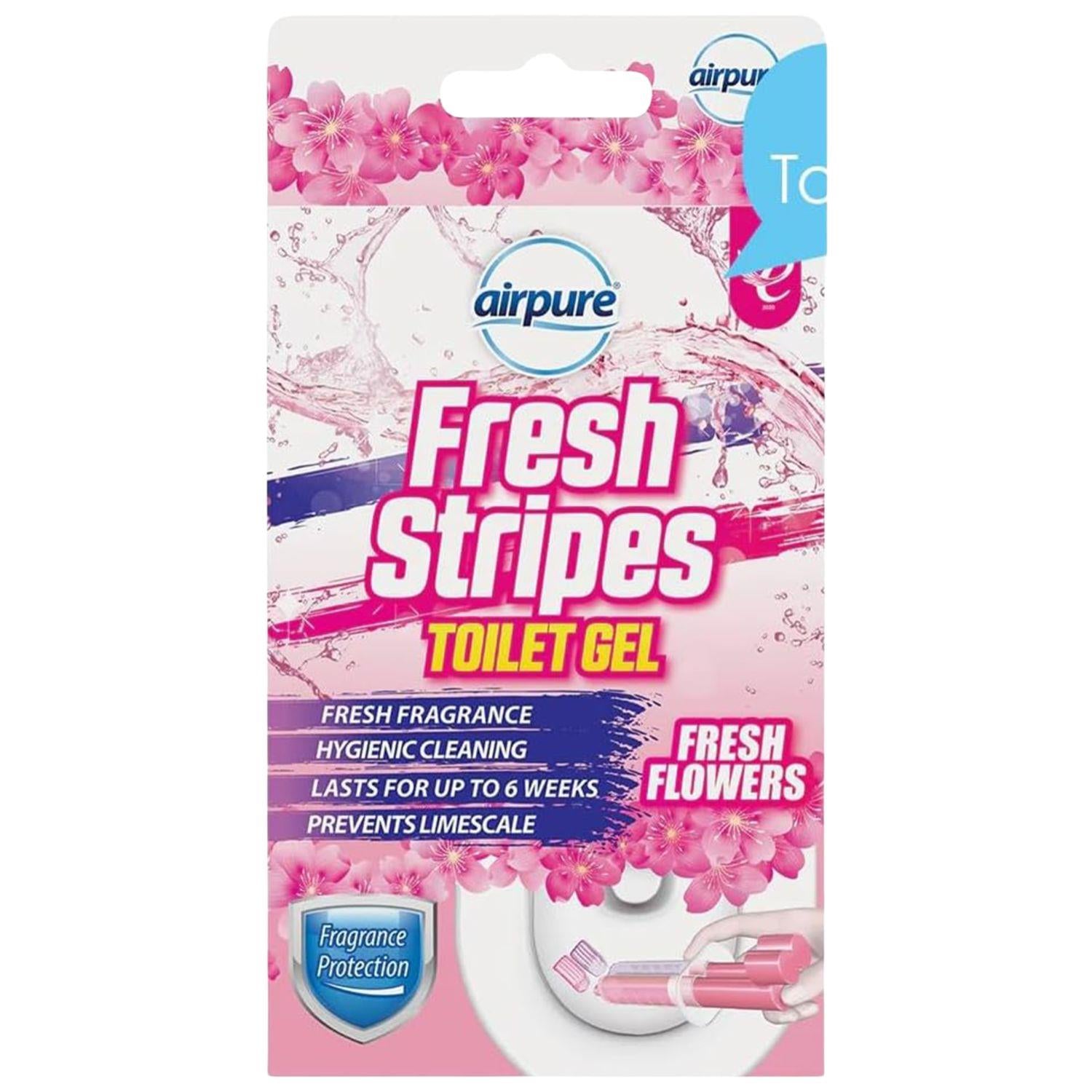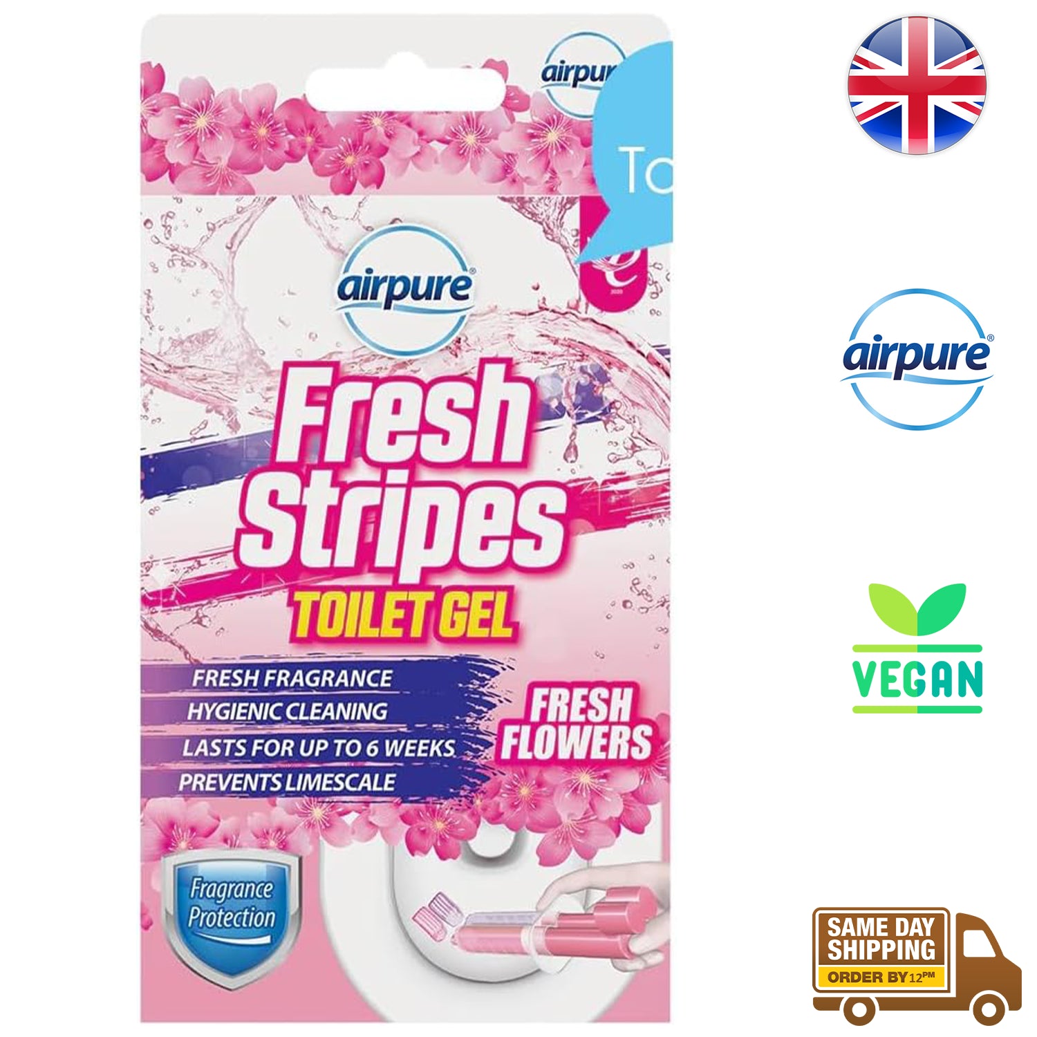 Airpure Fresh Stripes Toilet Gel, Specially formulated to clean and freshen your toilet for up to six weeks, this innovative toilet gel is equipped with a syringe-like applicator, ensuring precise and efficient application. Available in three fresh fragrances, each stripe not only cleans but also helps prevent limescale, making it a powerful hero for your toilet. Embrace a new level of toilet cleanliness and fragrance that lasts.