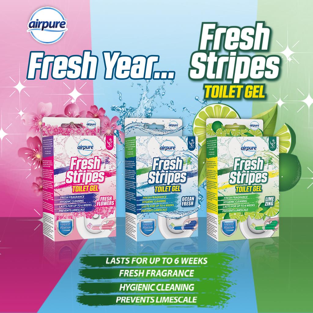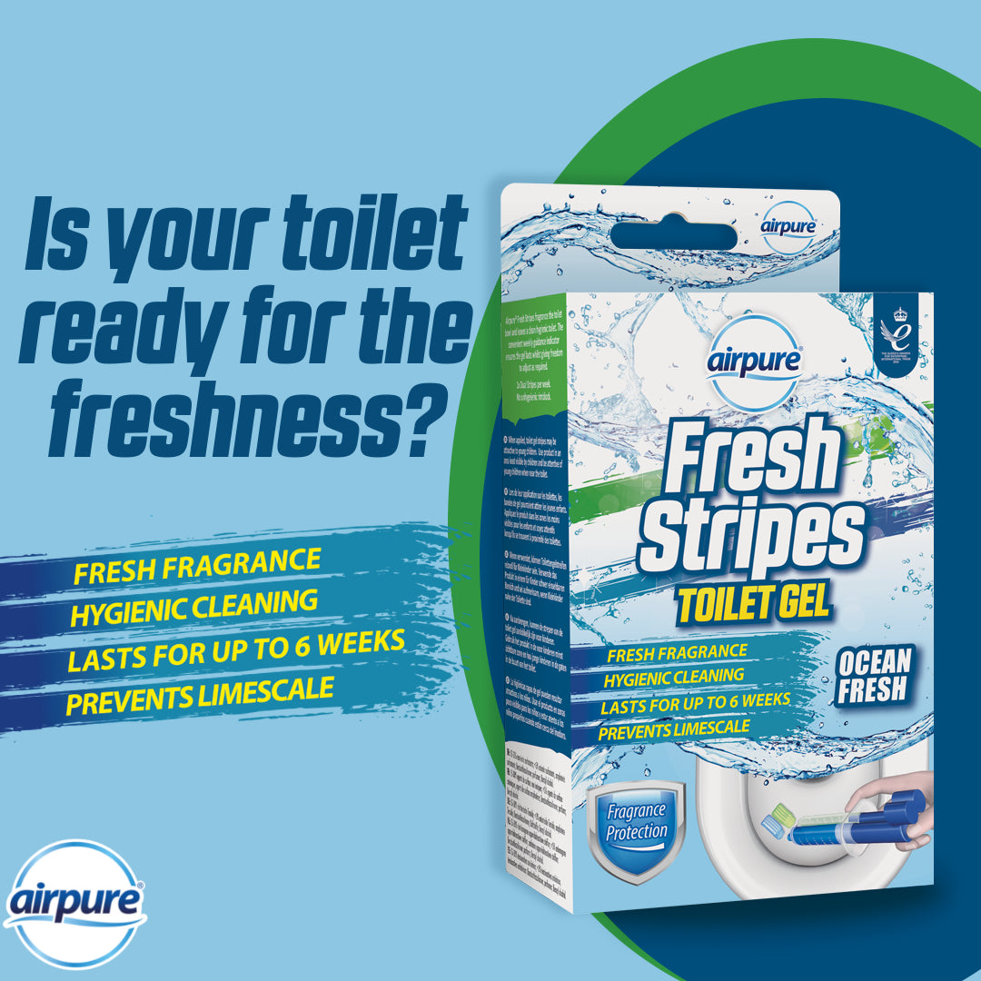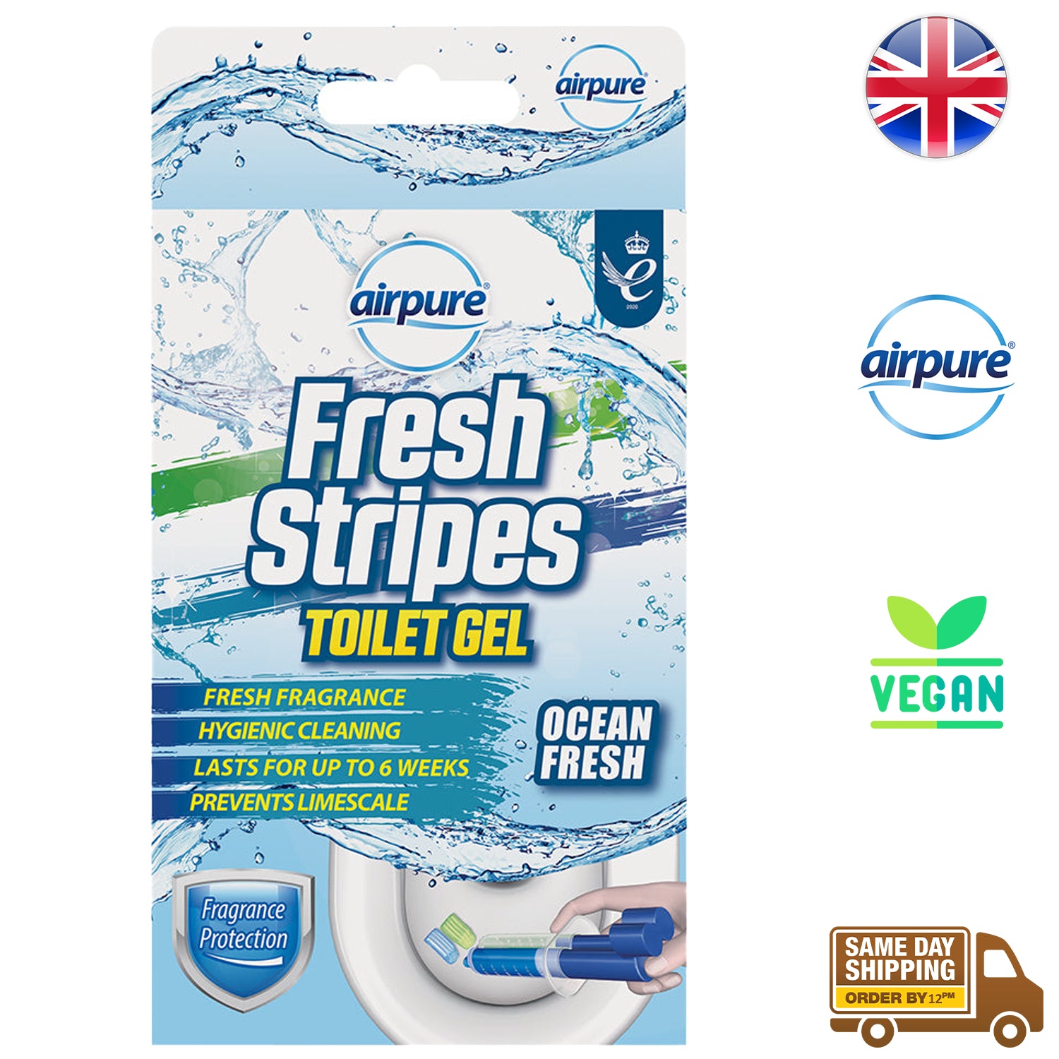Airpure Fresh Stripes Toilet Gel, Specially formulated to clean and freshen your toilet for up to six weeks, this innovative toilet gel is equipped with a syringe-like applicator, ensuring precise and efficient application. Available in three fresh fragrances, each stripe not only cleans but also helps prevent limescale, making it a powerful hero for your toilet. Embrace a new level of toilet cleanliness and fragrance that lasts.