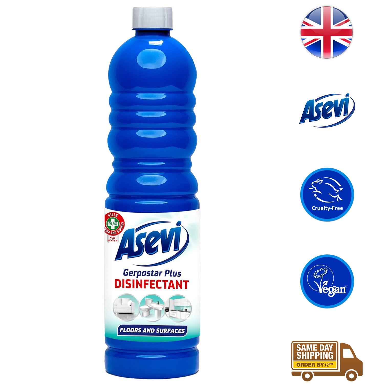 Asevi Disinfectant Floor & Surface Cleaner, a powerful solution designed to elevate your cleaning routine. This versatile cleaner is formulated to remove 99.9% of germs and bacteria throughout your home without the need for bleach. With confidence, it can be applied to all hard floor types, including tiles, natural stone, and laminate floors, as well as household surfaces such as worktops, toilets, and sinks. Asevi simplifies your cleaning regimen, eliminating the need for multiple products.