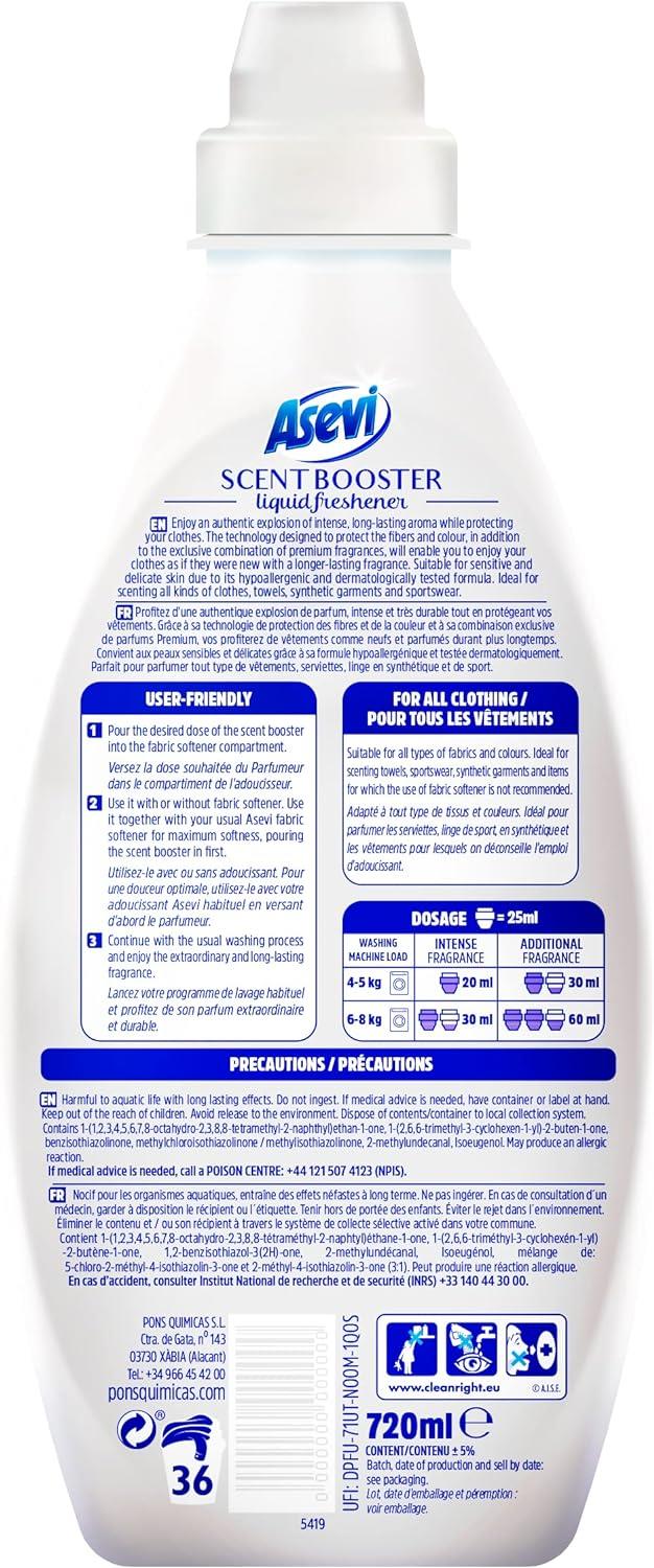 Elevate your laundry experience with Asevi Laundry Scent Booster Liquid in the invigorating Green Freshener Fragrance. This 720ml bottle promises up to 36 washes, infusing your clothes with a burst of refreshing scent. Transform each wash into a fragrant delight with Asevi's premium Laundry Scent Booster.