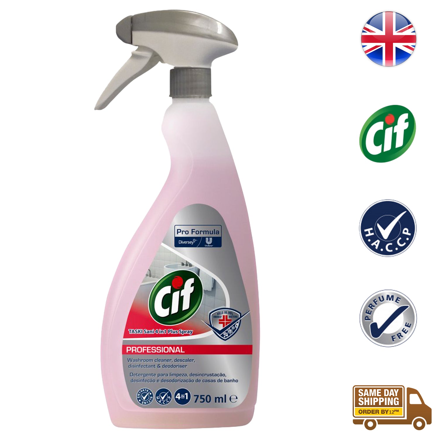 Cif Professional 4in1 Washroom Spray, a versatile cleaning powerhouse that combines the functions of cleaner, descaler, disinfectant, and deodorizer in one effective formula. Specially crafted for washroom environments, this spray ensures a thorough clean, leaving your washroom surfaces not only visibly spotless but also hygienically safeguarded.
