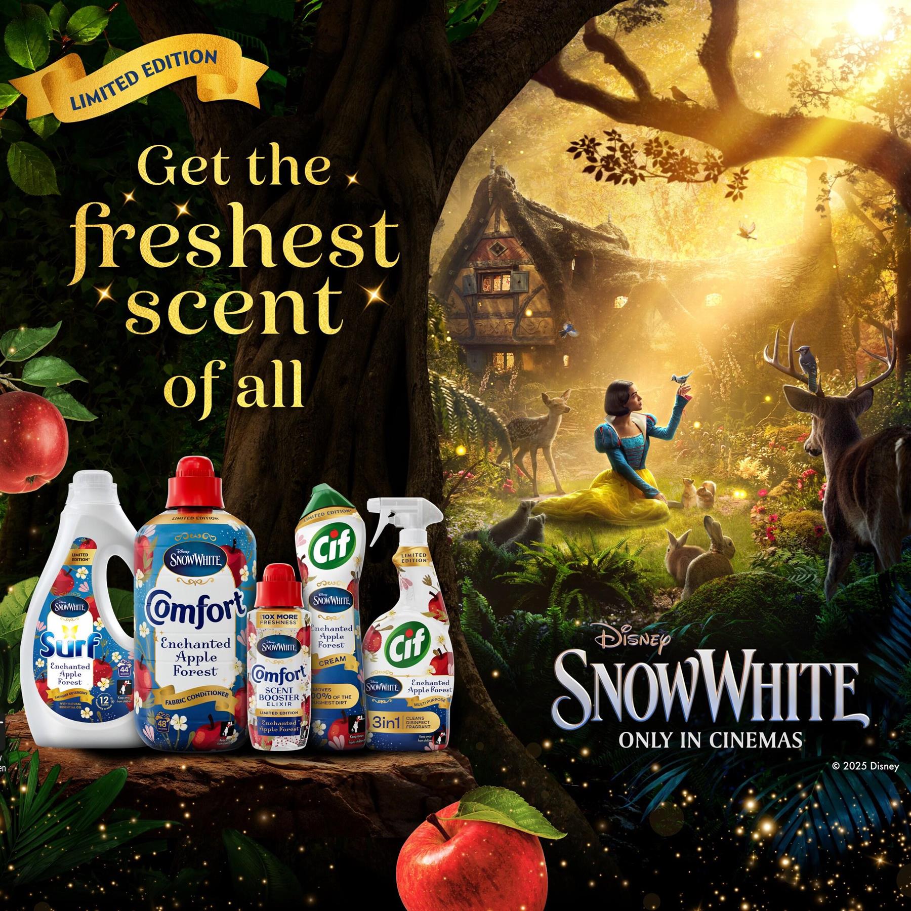 Experience magical cleaning power with Cif Enchanted Apple Forest Cream Cleaner, inspired by Disney’s Snow White. Infused with a delightful apple fragrance, this multi-surface cleaner removes 100% of the toughest dirt while requiring less rinsing, making cleaning easier and more efficient. The micro-particles and powerful formula cut through grease, limescale, and stubborn stains without damaging surfaces, leaving them sparkling clean and beautifully scented. Perfect for use in the kitchen, bathroom, and all around the home, this versatile cleaner ensures effortless shine with a long-lasting fresh scent.