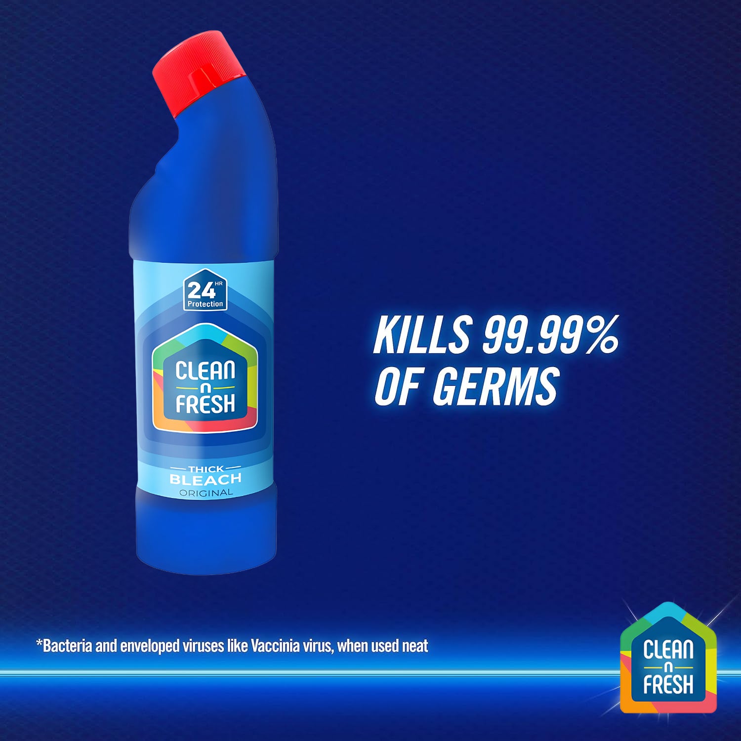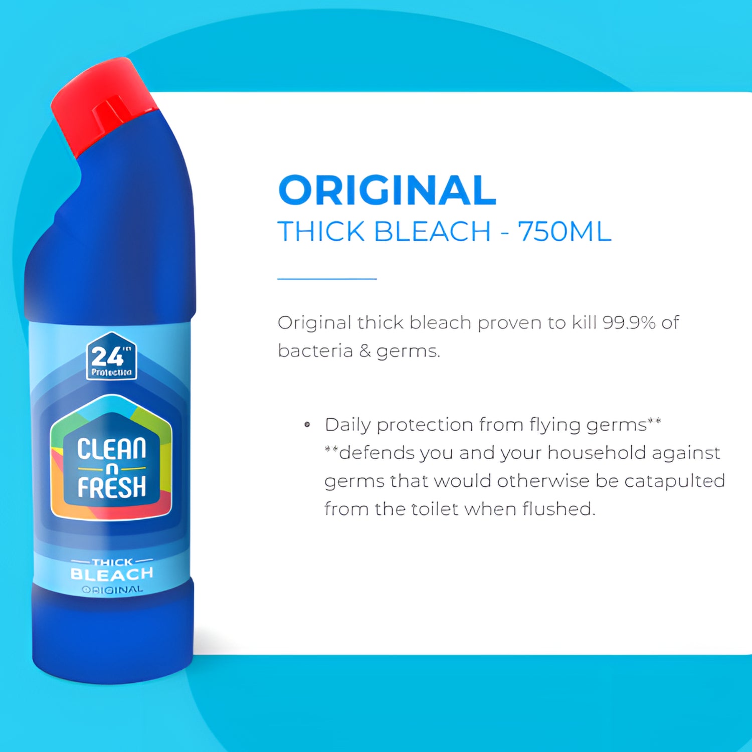 Clean N Fresh Thick Bleach Original is a highly effective multi-purpose cleaner that tackles tough stains and ensures a hygienic environment by killing 99.9% of bacteria and germs. Its thick, clinging formula provides maximum cleaning power, making it perfect for use in bathrooms, kitchens, and other areas where cleanliness is paramount. The original scent leaves your home smelling fresh and clean, while the powerful formula keeps surfaces sparkling and free from harmful germs. Whether you’re cleaning toilets, sinks, worktops, or floors, Clean N Fresh Thick Bleach Original is a reliable choice for a thorough, deep clean.