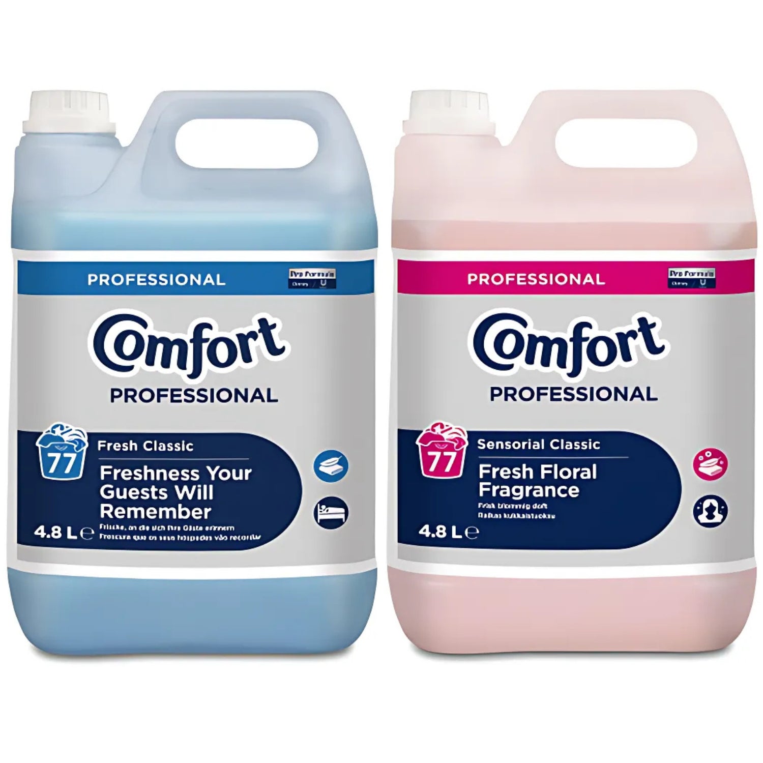 Experience the ultimate fabric care with our Fabric Conditioner Bundle, combining the trusted quality of Comfort Professional. This bundle includes two 4.8L bottles of Comfort Professional Fabric Conditioner in Fresh Classic and Sensorial Classic scents, each providing 77 washes. Together, these conditioners deliver long-lasting softness, vibrant scents, and enhanced fabric protection, making your laundry feel and smell incredible.