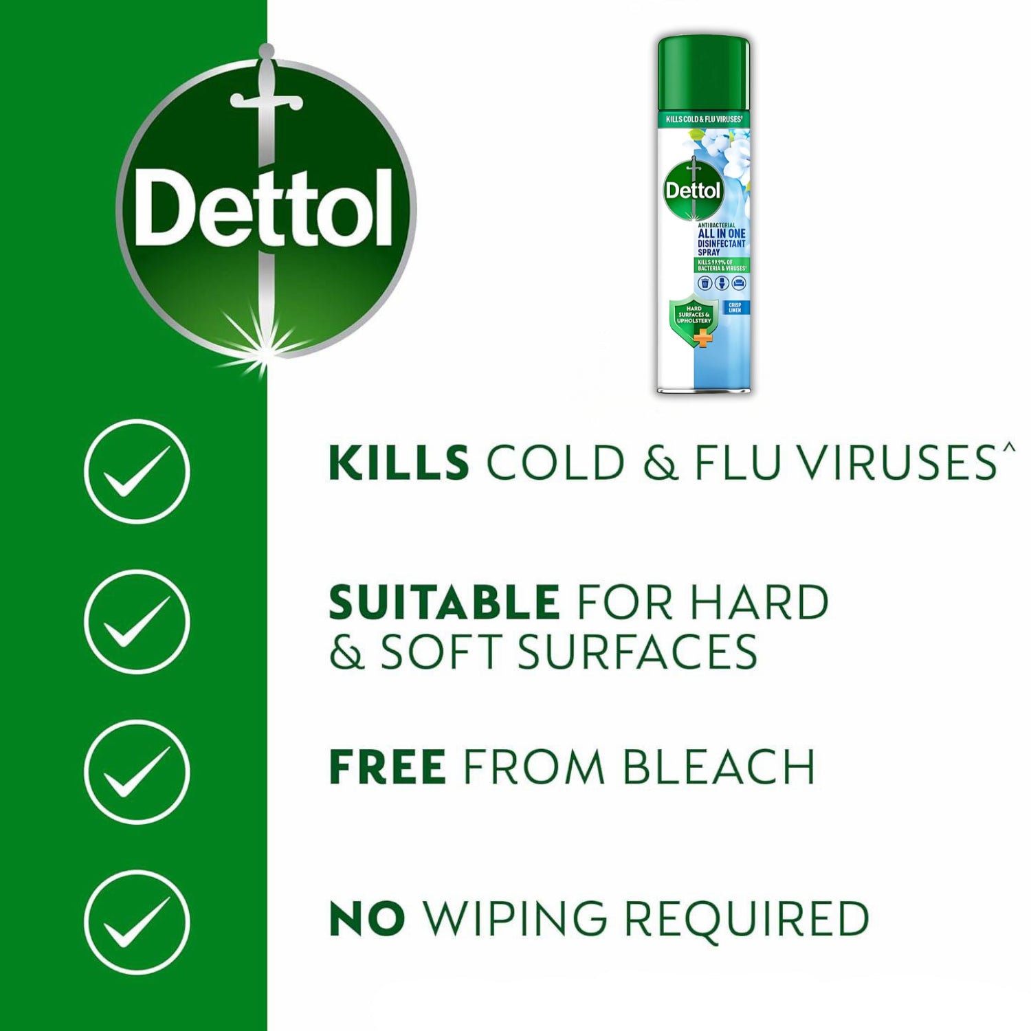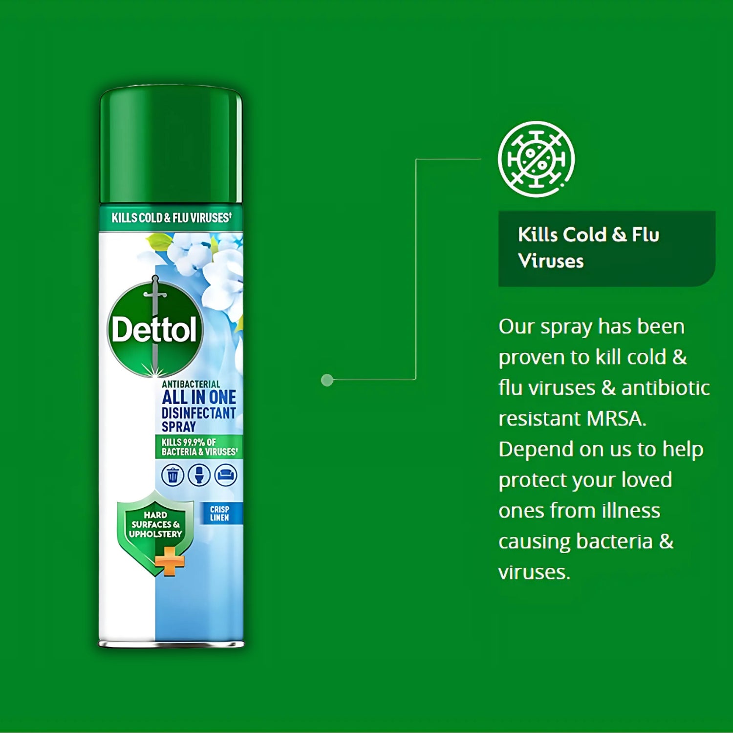 Protect your home and loved ones with Dettol All-In-One Disinfectant Spray. This versatile spray effectively kills 99.9% of bacteria and viruses, including cold and flu viruses, while leaving a fresh, clean scent. Designed for multi-surface use, it cleans, disinfects, and eliminates unpleasant odours, making it ideal for high-touch areas like doorknobs, countertops, and bathroom surfaces. A trusted solution for maintaining a hygienic and fresh-smelling environment.