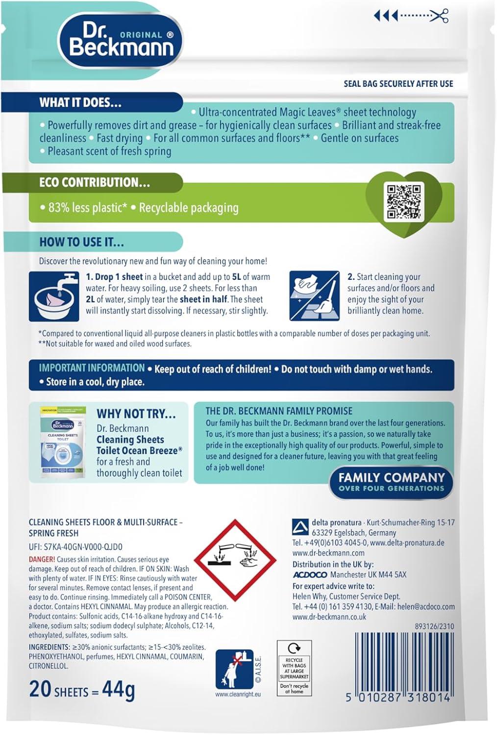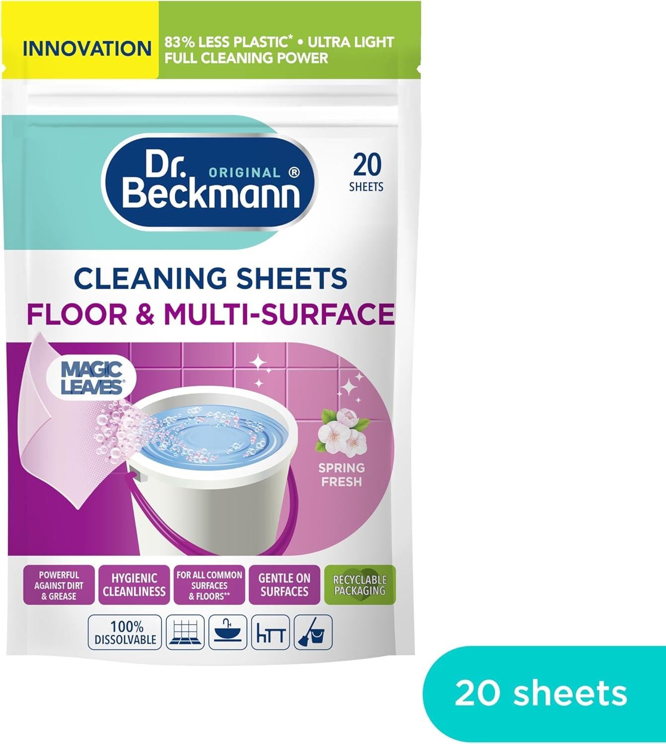 Dr. Beckmann Magic Leaves Floor & Multi Surface Cleaner in Spring Fresh fragrance offers a revolutionary cleaning experience with water-soluble sheets. These powerful yet gentle sheets are designed to tackle dirt and grease effortlessly, providing a convenient and effective solution for all your cleaning needs. Each pack contains 20 sheets, ensuring long-lasting freshness and cleanliness for your home.