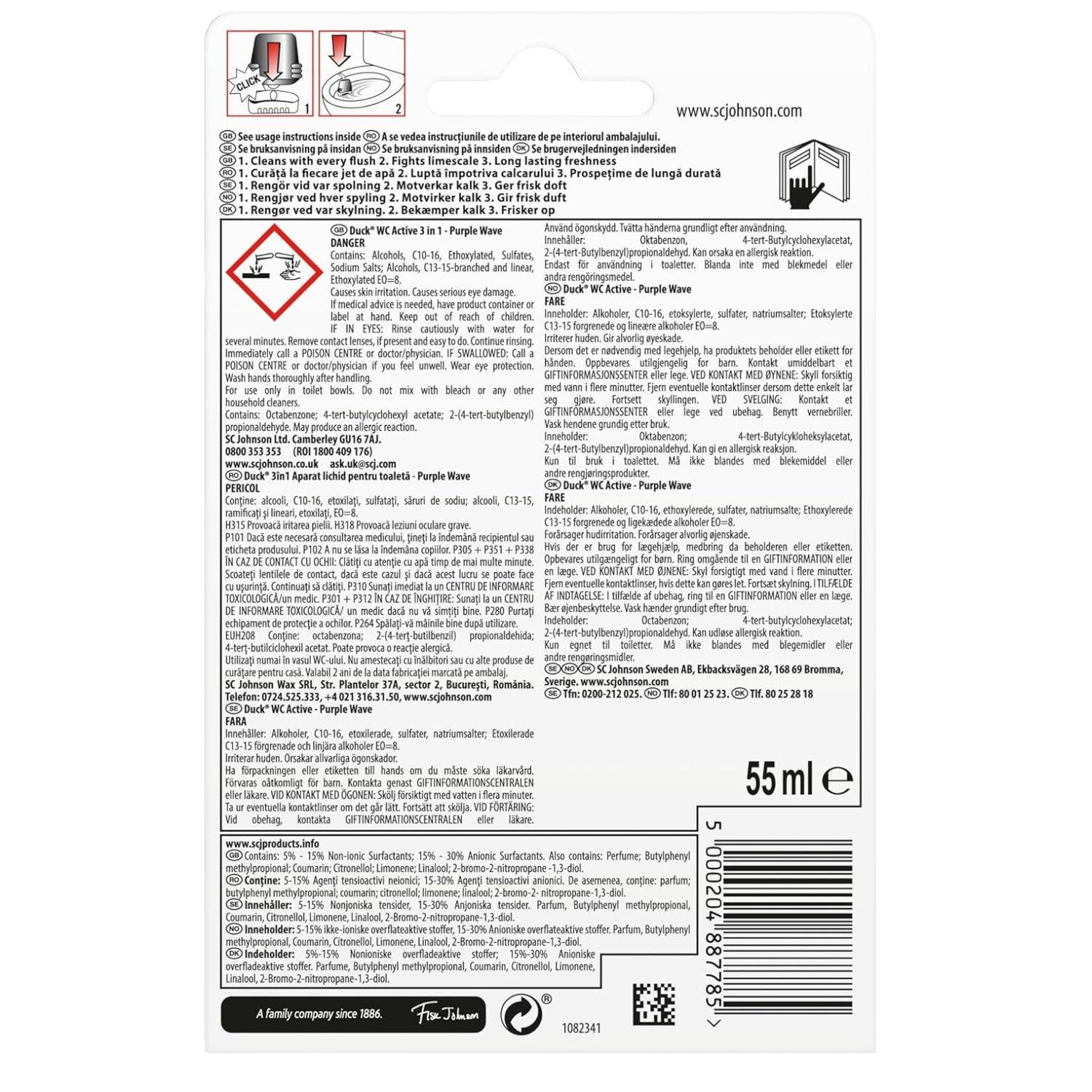 The Duck WC Active 3 In 1 Purple Wave Liquid Rimblock — a triple-action powerhouse that cleans, freshens, and fights limescale every time you flush. With its unique liquid delivery system, it coats your toilet bowl with a refreshing Purple Wave scent that’s so nice, it could probably get a standing ovation if it walked into a room.