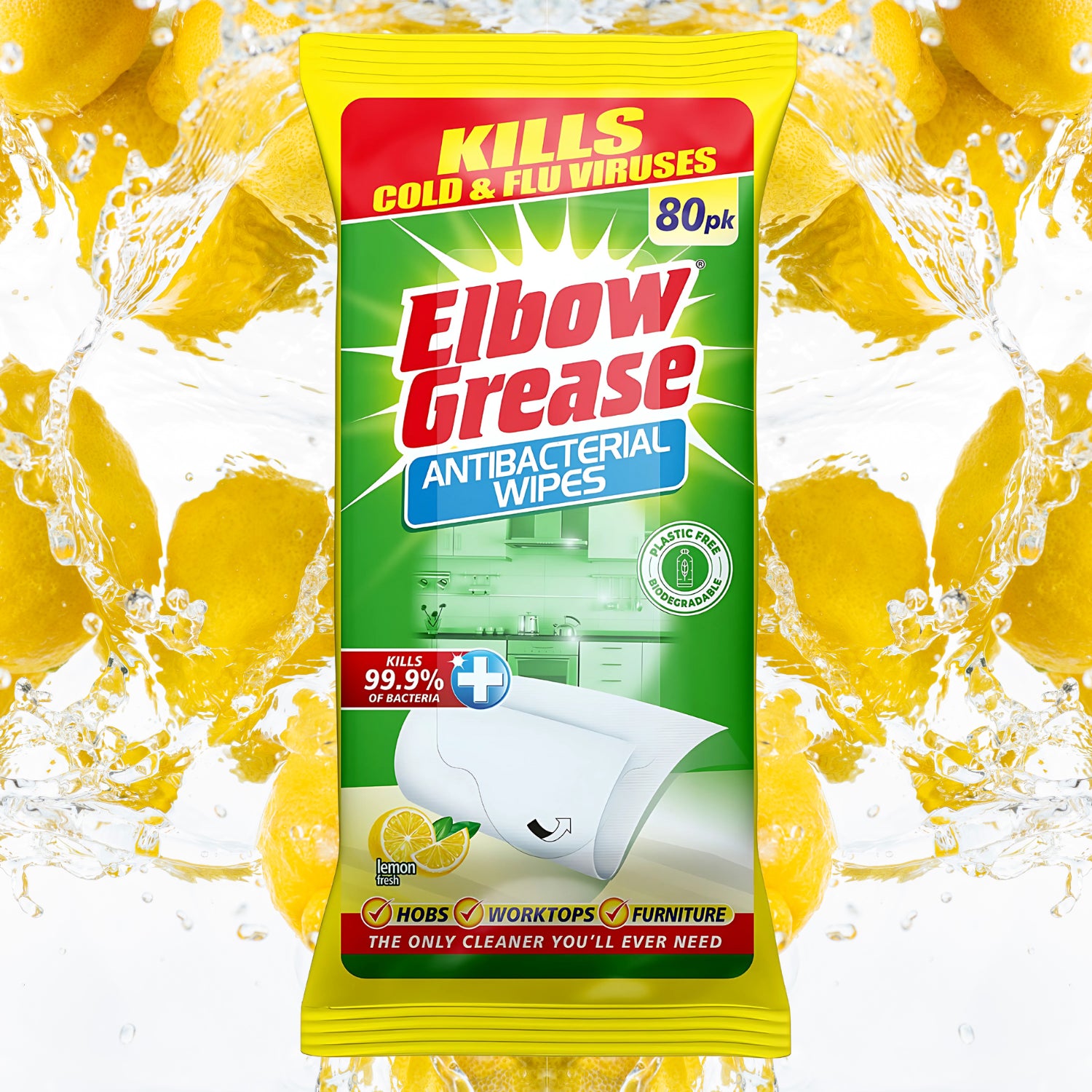 Elbow Grease Anti Bacterial Wipes Lemon Surface Cleaner Dirt Remover 80Pk