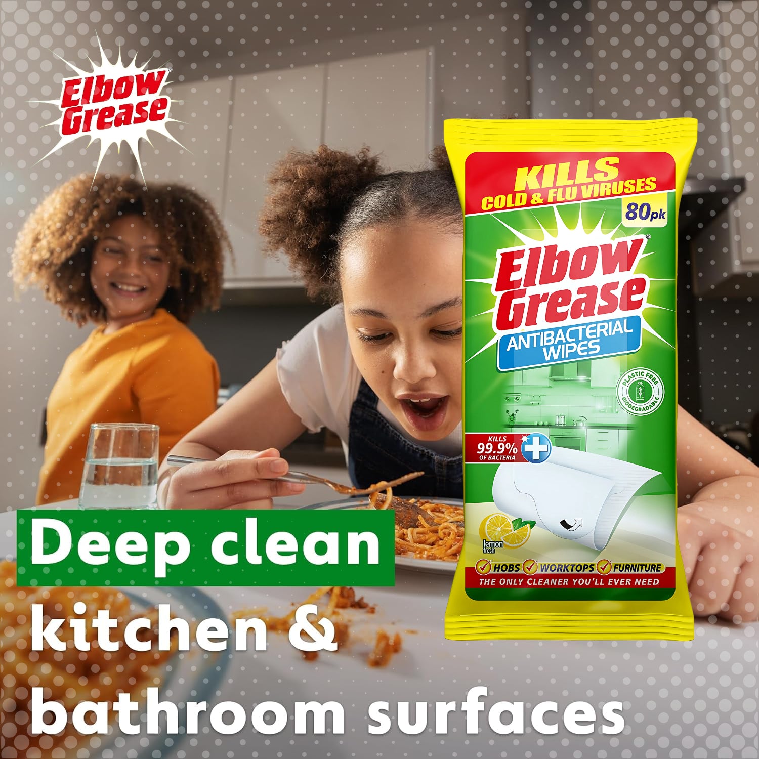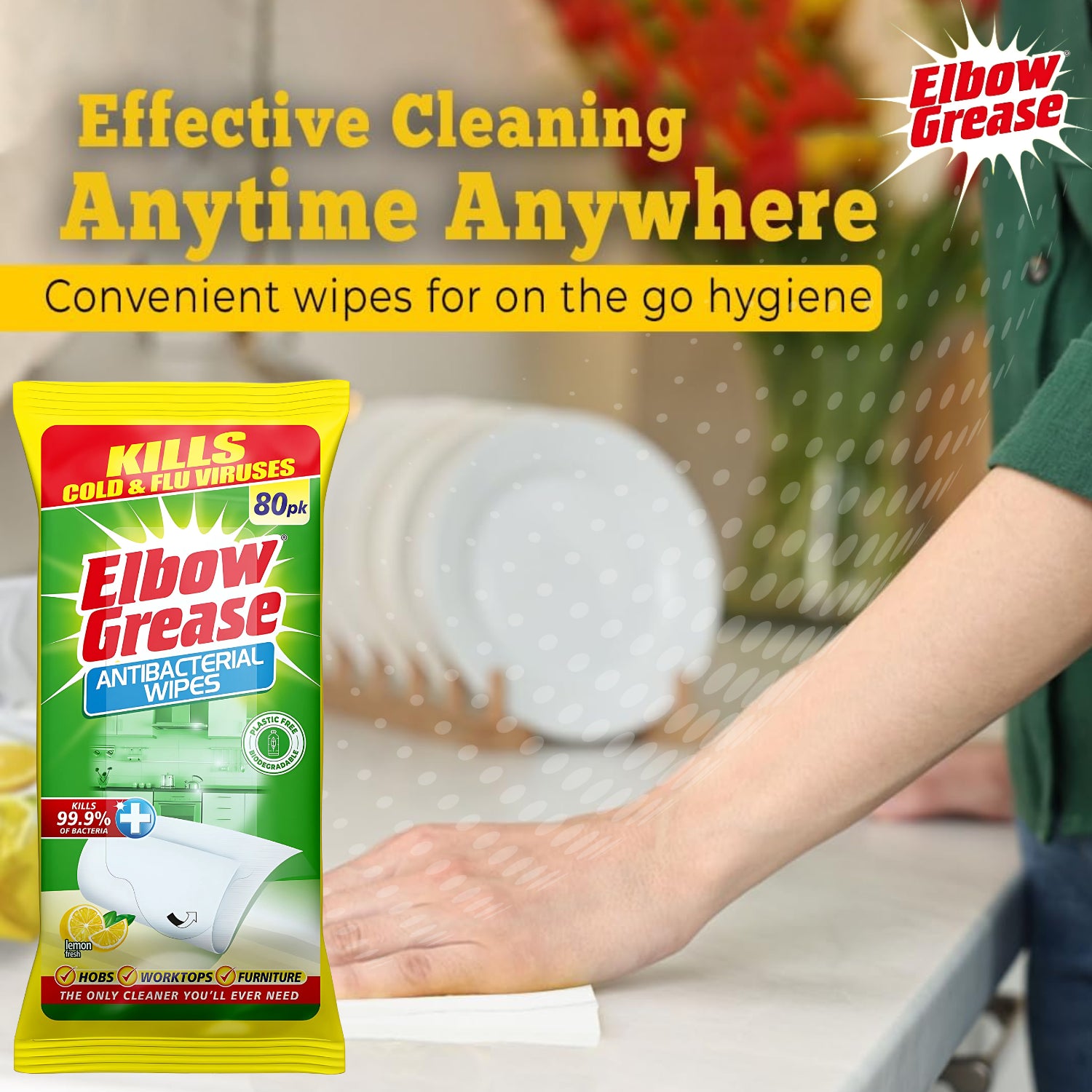 Keep your home spotless and hygienic with Elbow Grease Anti-Bacterial Wipes. Each pack contains 80 durable and pre-moistened wipes designed to clean and sanitize most surfaces, including hobs, furniture, and worktops. With their powerful anti-bacterial formula, these wipes effectively remove dirt, grease, and grime while killing germs, making them ideal for daily cleaning tasks. Convenient and easy to use, they are perfect for quick clean-ups and maintaining a fresh, germ-free environment.