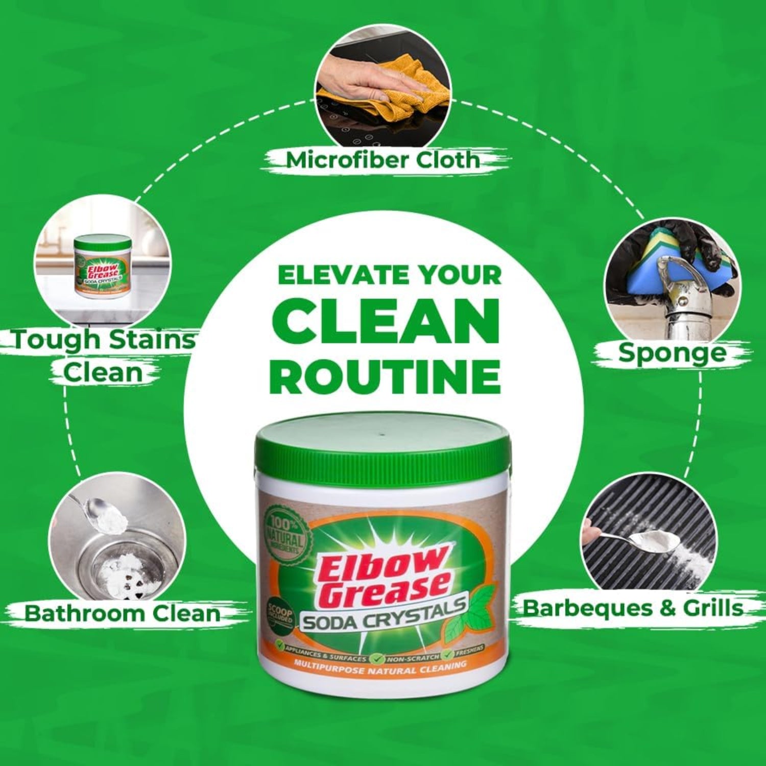 Elbow Grease Soda Crystal Cleaner is a powerful, multi-purpose cleaning solution designed to tackle tough dirt, grease, and grime around the home. Perfect for a wide range of cleaning tasks, from surfaces and appliances to laundry and drains, this versatile product delivers effective results every time. Its strong cleaning action cuts through stubborn stains, leaving surfaces sparkling clean.
