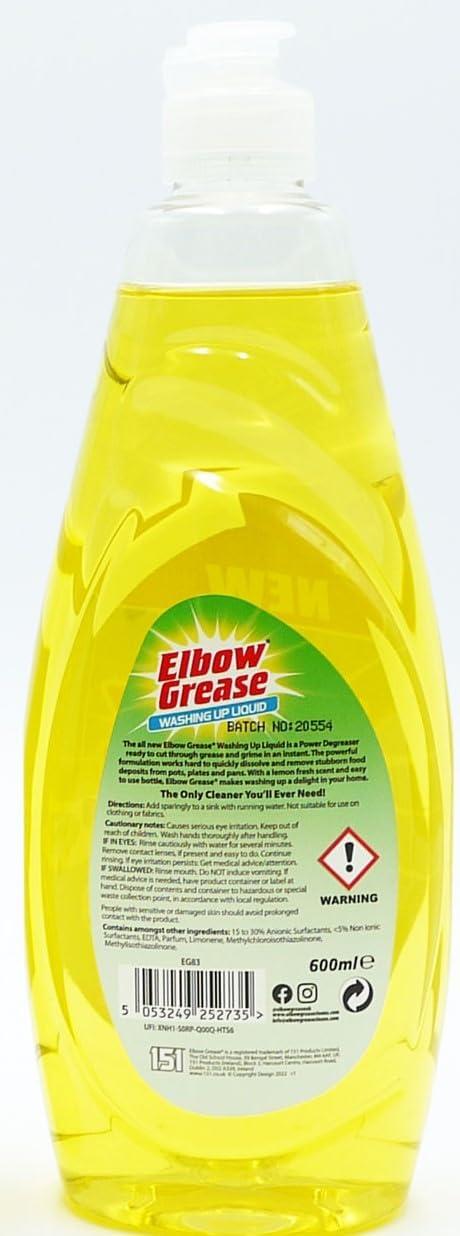Elbow Grease Washing Up Liquid Bottle – a potent degreaser that effortlessly tackles grease and grime on contact. Its robust formula swiftly dissolves and eradicates stubborn food residues from pots, pans, and dishes. Infused with a refreshing lemon fragrance and packaged in an intuitive Plastic bottle, Elbow Grease transforms dishwashing into an enjoyable task at home.