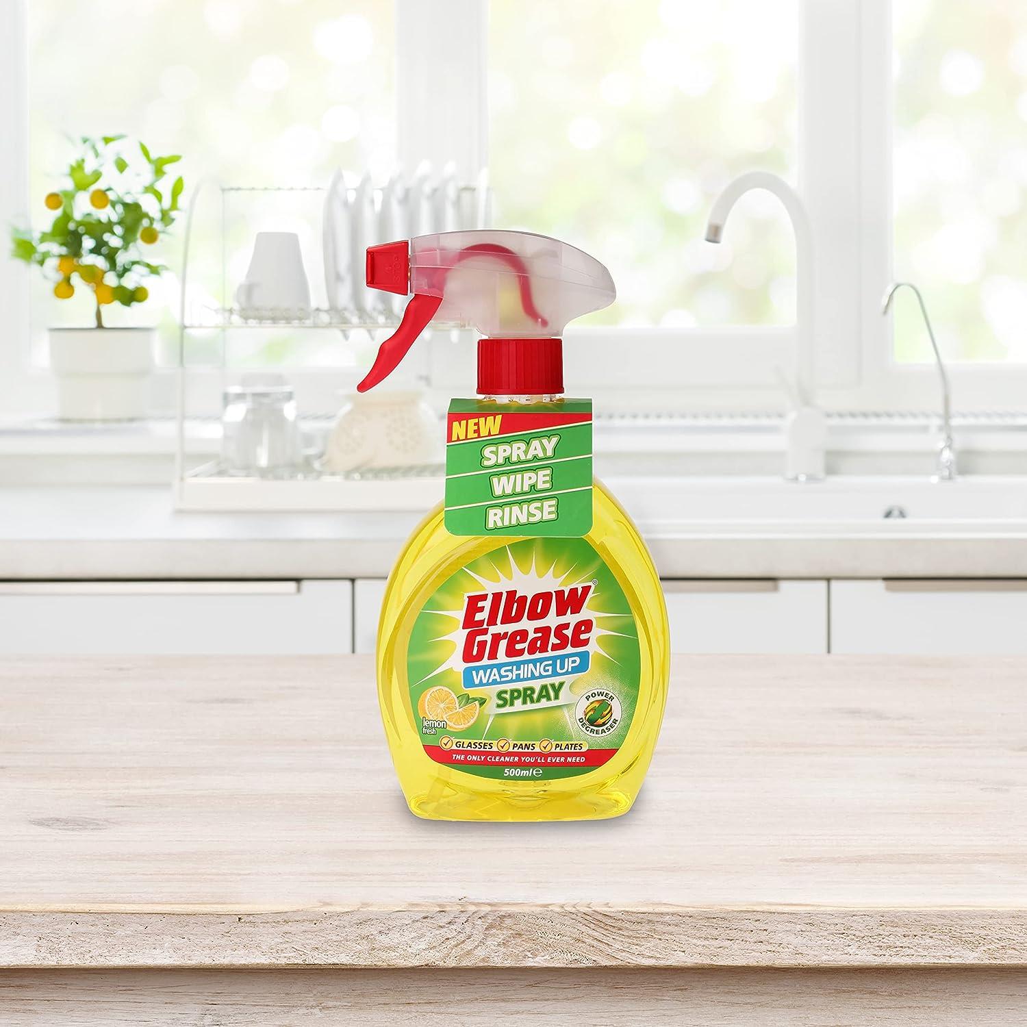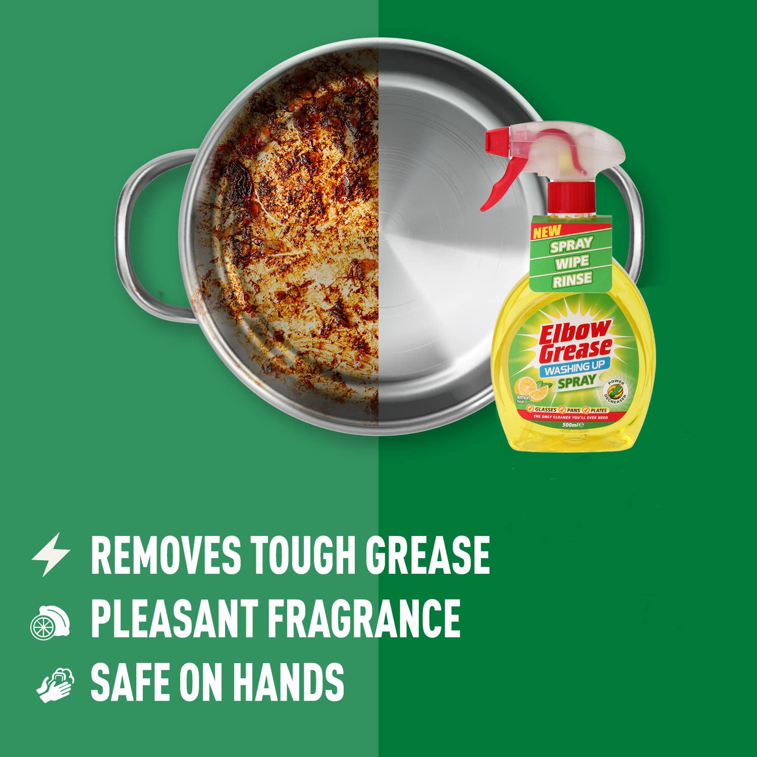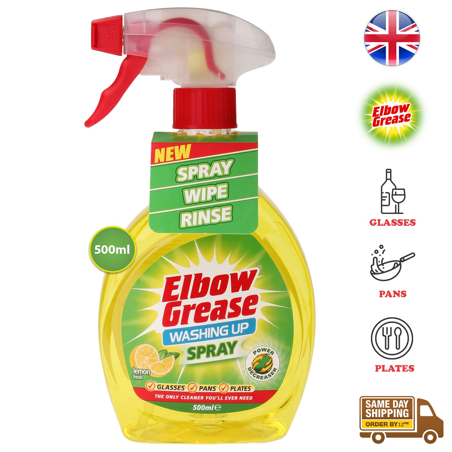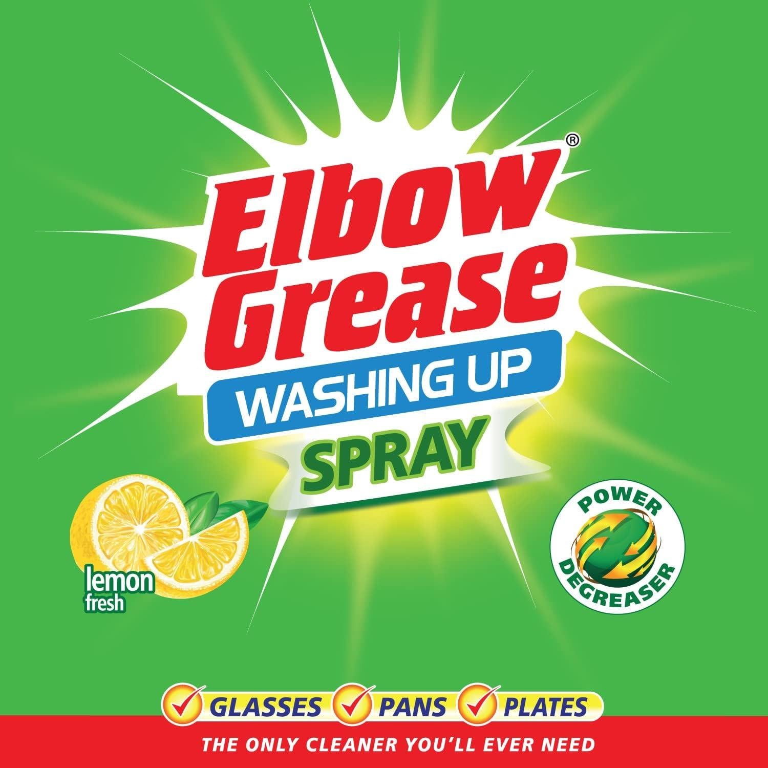 The all new elbow grease washing up spray is a power degreaser spray that is ready to cut through grease and grime in an instant. The powerful formulation works hard to quickly dissolve and remove stubborn food deposits from pots, plates and pans. With a lemon fresh fresh scent and easy to use spray bottle, elbow grease makes washing up a delight in your home.
