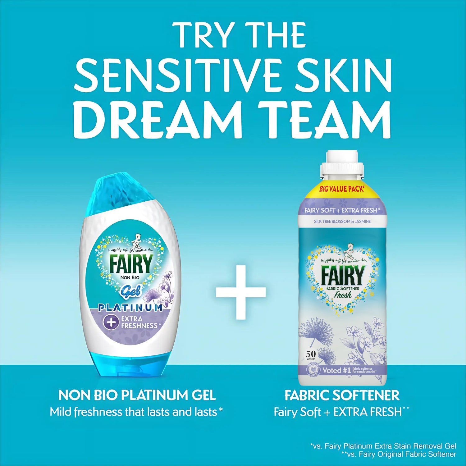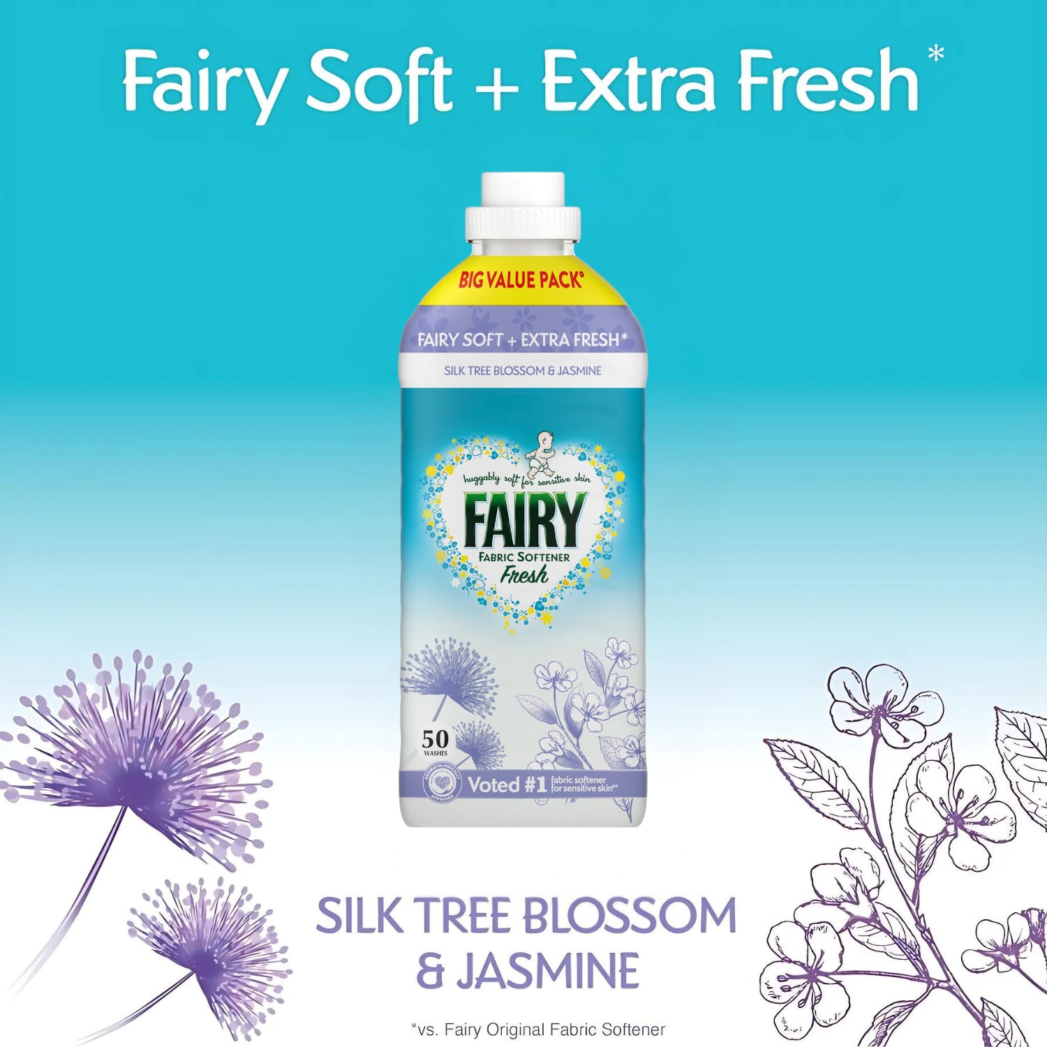 Fairy Fabric Softener Fresh Silk Tree Blossom & Jasmine is specially crafted to provide long-lasting softness and a delicate fragrance to your laundry. Its gentle formula makes it suitable for sensitive skin, offering the same level of care that Fairy is known for. Infused with a refreshing blend of Silk Tree Blossom and Jasmine, this fabric softener brings a calming, fresh aroma to your fabrics. Ideal for baby clothes and those with delicate skin, it offers 50 washes in every bottle, ensuring clothes stay soft, fresh, and lightly scented.