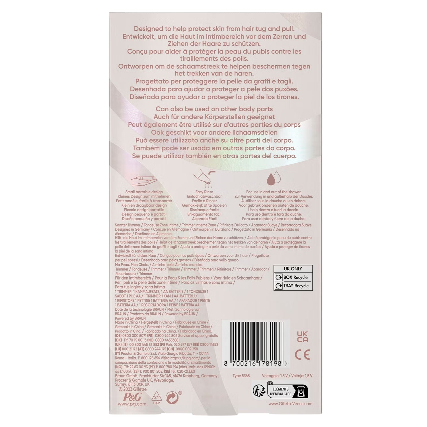 The Venus for Pubic Hair & Skin Gentle Trimmer offers a tool for women who prefer to trim and shape their pubic hair. The trimmer also is designed to help protect pubic skin from hair tug and pull and provides gentle hair removal with skin protection fins. This gentle trimmer is waterproof and can be used either in or out of the shower.