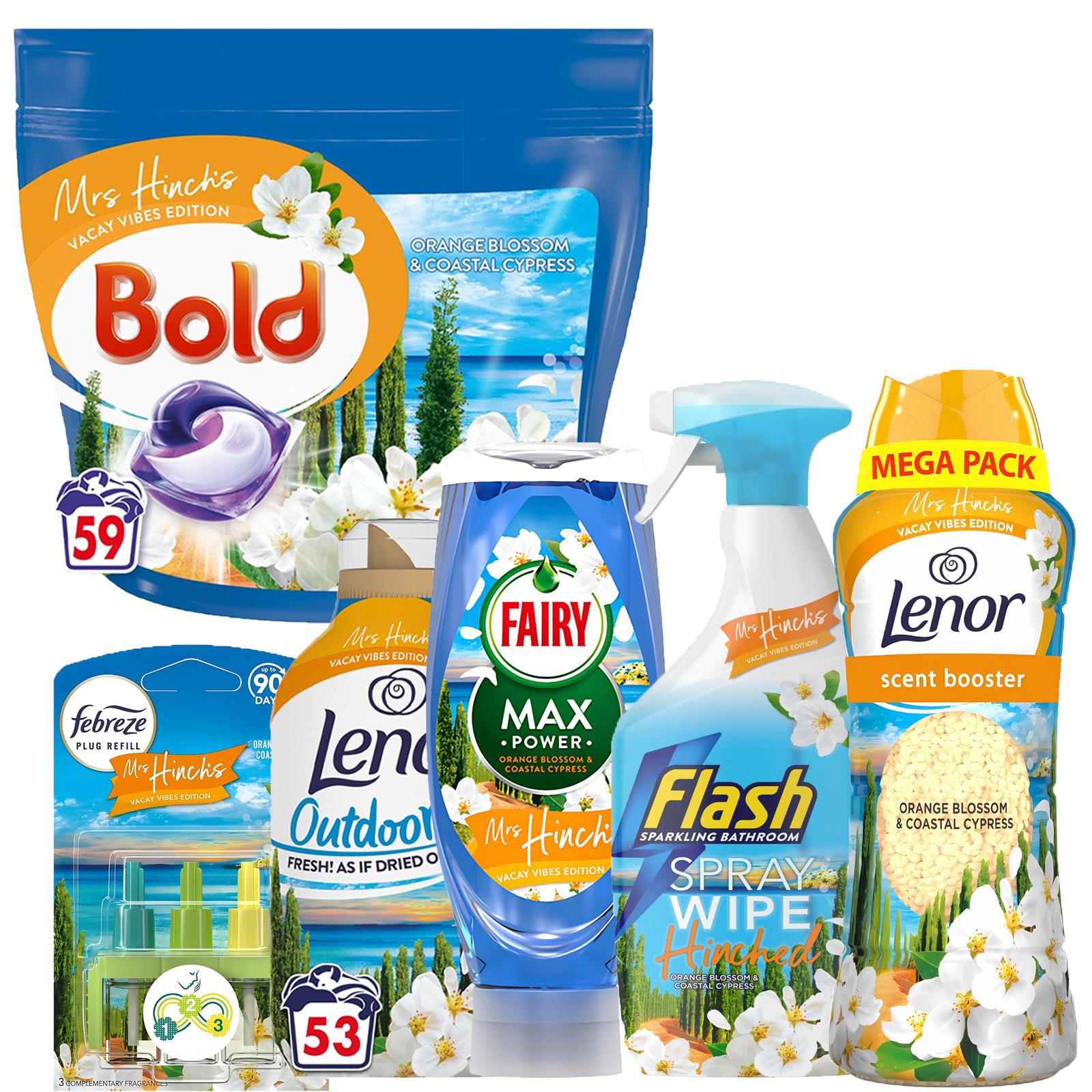Transform your home and laundry routine into a paradise of freshness with the Lenor Fairy Flash Febreze Mrs. Hinch's Vacay Vibes Edition Bundle Set in the delightful scent of Orange Blossom & Coastal Cypress. This curated collection combines cleaning, laundry care, and air freshening to create a serene, holiday-like ambiance in every corner of your home.