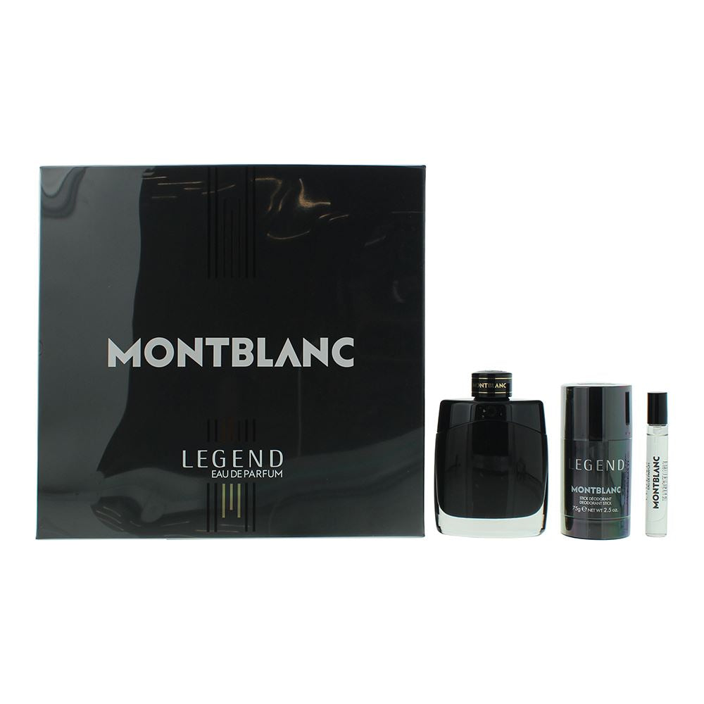 Montblanc Legend 3-Piece Gift Set: A timeless and charismatic trio featuring a 100 ml Eau de Parfum, a 7.5 ml travel-size Eau de Parfum, and a 75 g deodorant stick�crafted for the confident and unforgettable man.