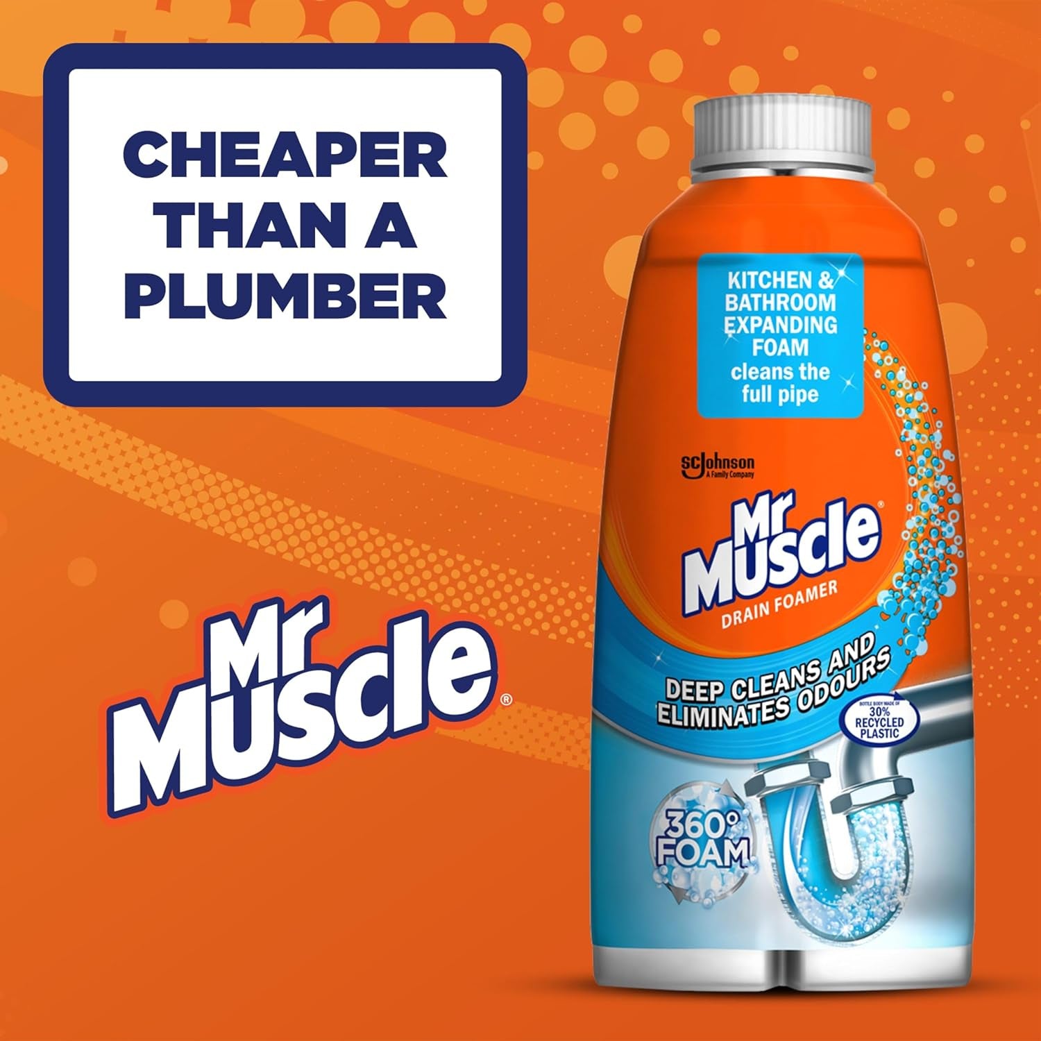 Clear and maintain your drains effortlessly with Mr Muscle Drain Foamer Pipe Cleaner. This expanding foam penetrates deep into pipes to dissolve grease, grime, and soap scum, leaving your drains fresh and clog-free. Ideal for kitchen sinks and bathroom drains, this advanced formula ensures a thorough clean that prevents future buildup. With its effective action and convenient 500ml bottle, Mr Muscle Drain Foamer is your go-to solution for cleaner, fresher drains.