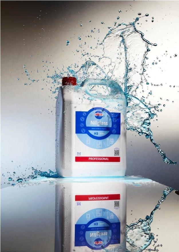 Nilco Nilglass Professional H3 Glass and Mirror Cleaner 5 Litre Smear-Free Shine for Pristine Clarity, Achieve crystal-clear, streak-free results. Designed for professional and household use, this high-performance formula effortlessly removes grease, dirt, and fingermarks from glass, mirrors, and reflective surfaces. Whether you're cleaning windows, windscreens, or polished surfaces, Nilco Nilglass ensures a flawless finish with minimal effort.