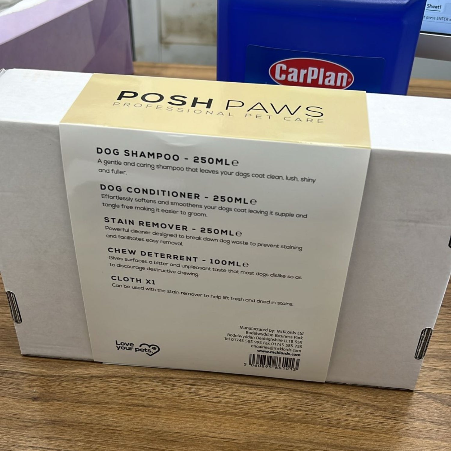 The Posh Paws Professional Pet Dog Care Kit is designed to give your furry friend a salon-like grooming experience at home. This 5-piece set includes a dog shampoo, conditioner, stain remover, chew deterrent, and a cloth, all specially formulated to care for your dog's skin, coat, and hygiene. Whether you're dealing with stubborn stains or want to keep your dog’s coat soft and shiny, this kit has everything you need for complete grooming.