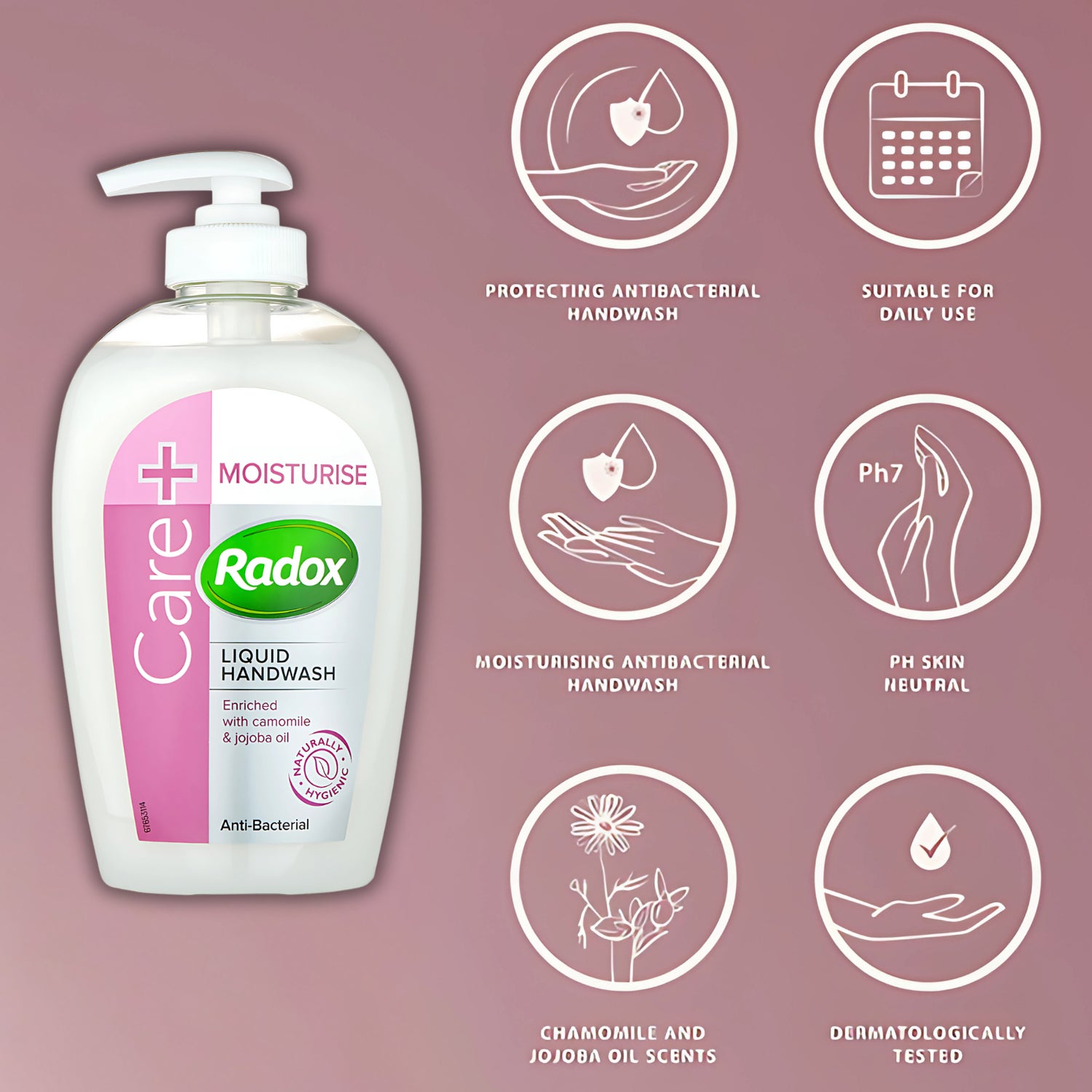Radox Handwash, a trusted Anti-Bacterial formula designed for a hygienically clean and moisturized experience. Soft on the skin yet tough on dirt, this handwash embodies the care and protection your family deserves. Enriched with moisture, it ensures each wash not only cleanses but also safeguards against dryness, offering a comprehensive solution for your hand care needs. Dermatologically tested, it stands as a reliable choice for maintaining optimal hand hygiene.