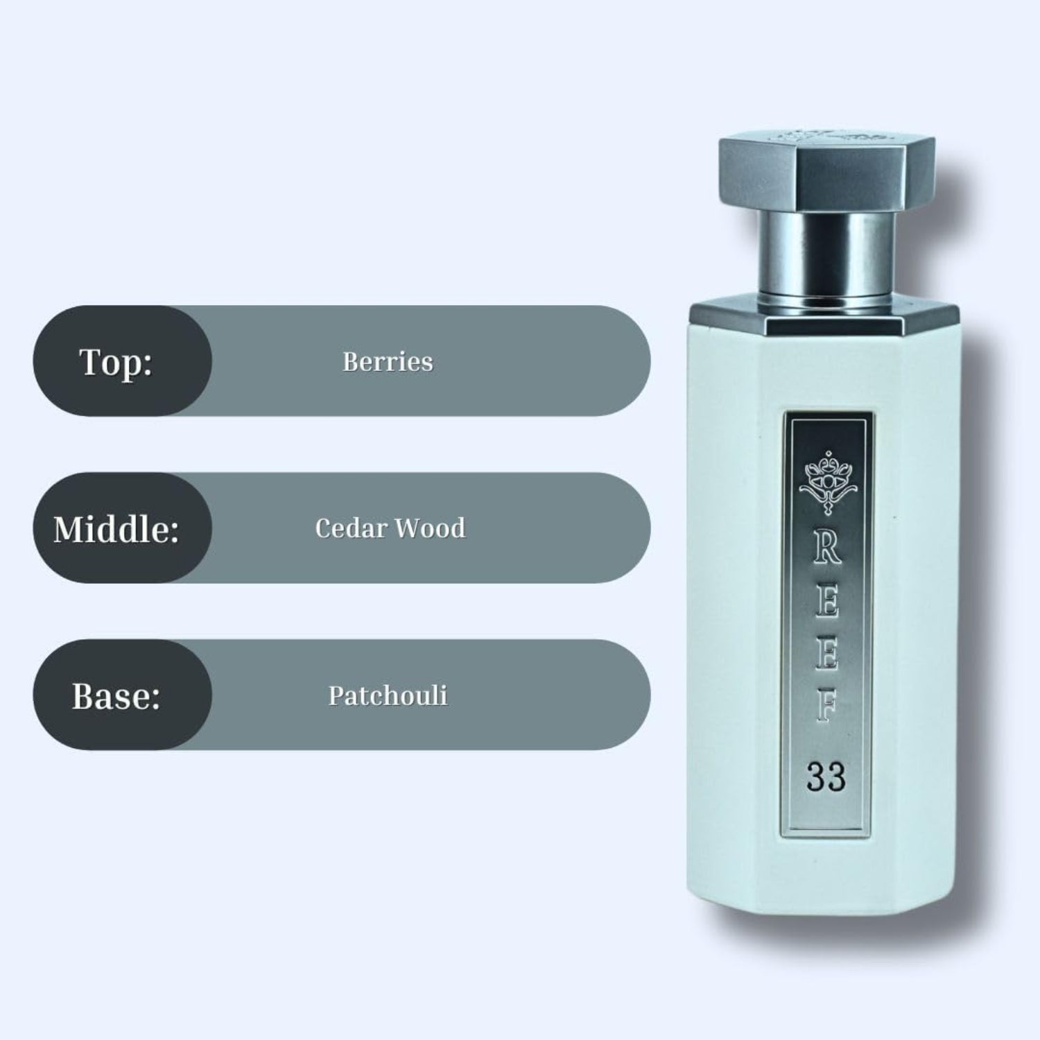 Reef 33 White by Reef Perfumes is a top-selling unisex fragrance that perfectly captures the harmony between strength and softness. Crafted for both men and women, this modern and elegant perfume opens with a luxurious note of enchanting saffron, instantly offering a sense of richness and sophistication. As the fragrance develops, the crisp, herbaceous scent of rosemary emerges, adding a fresh and vibrant character. Reef 33 White is ideal for those who seek a refined, versatile fragrance that leaves a lasting impression—whether for daily wear or special occasions.