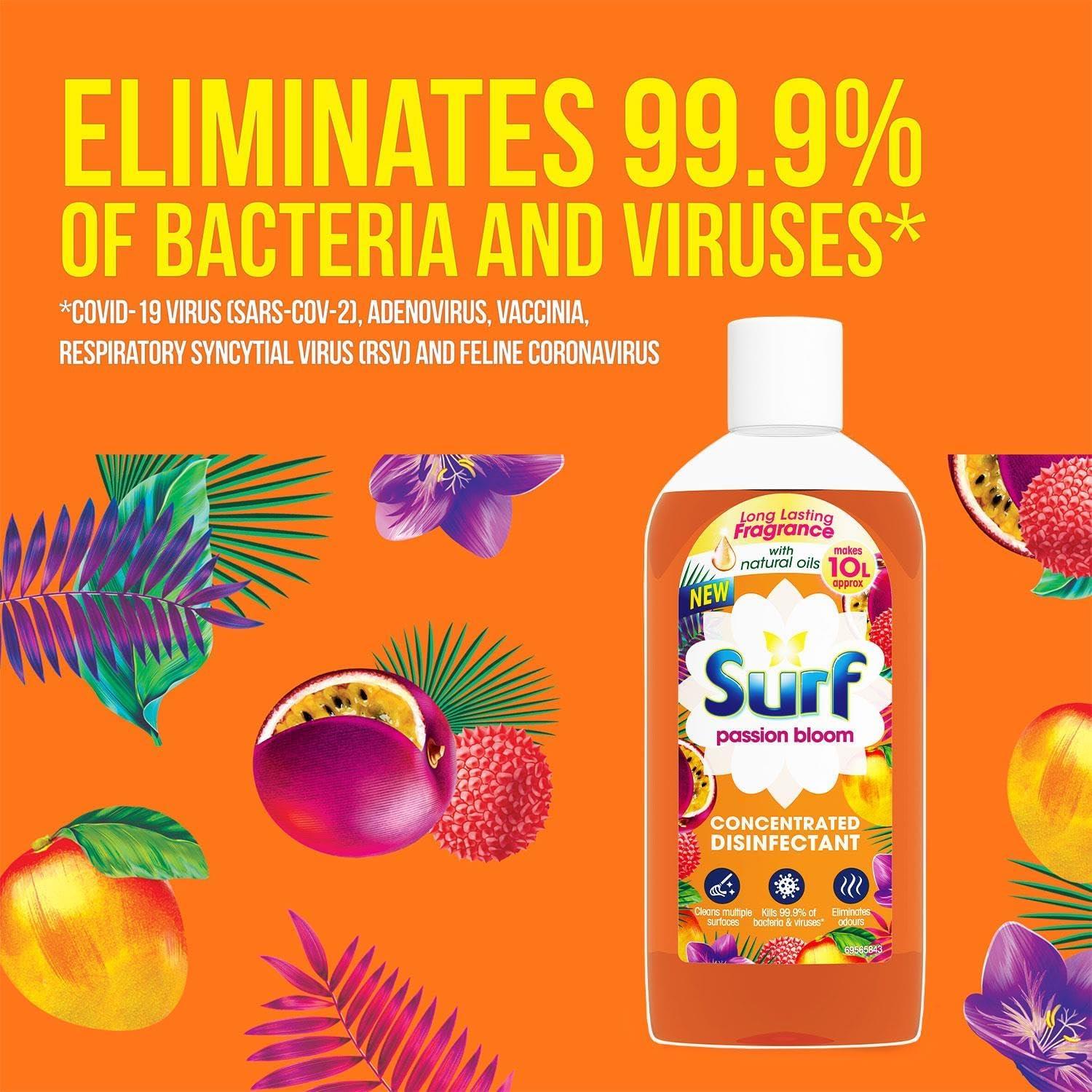 Surf Passion Bloom Concentrated Disinfectant is the perfect choice for a clean, fresh, and germ-free home with a luxurious floral touch.