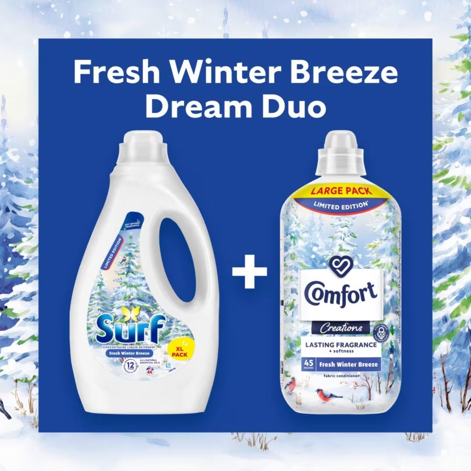 With Surf Fresh Winter Breeze Concentrated Liquid Detergent, you get powerful cleaning results, a fresh Winter Breeze scent, and the added benefits of natural essential oils, all in an economical 1.2L bottle.