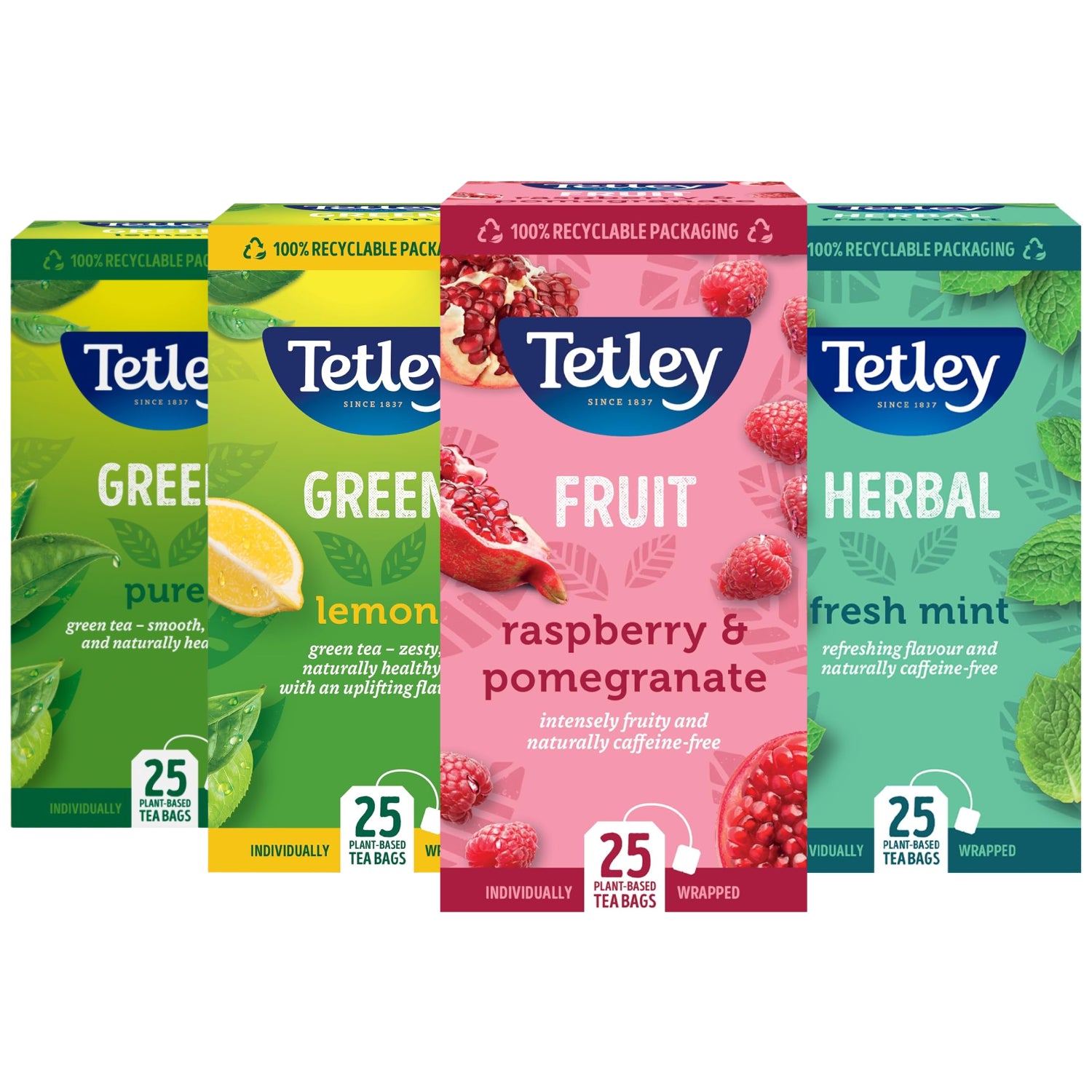 Tetley Green & Herbal Tea Bags, thoughtfully packed in individually wrapped sachets to preserve freshness and flavor. This assorted collection features a range of refreshing blends, including Pure Green Tea, Green Tea with Lemon, Fresh Mint Herbal Tea, and Raspberry & Pomegranate Infusion—perfect for any mood or moment. Whether you need a calming cup or a fruity lift, Tetley delivers quality taste with every brew.