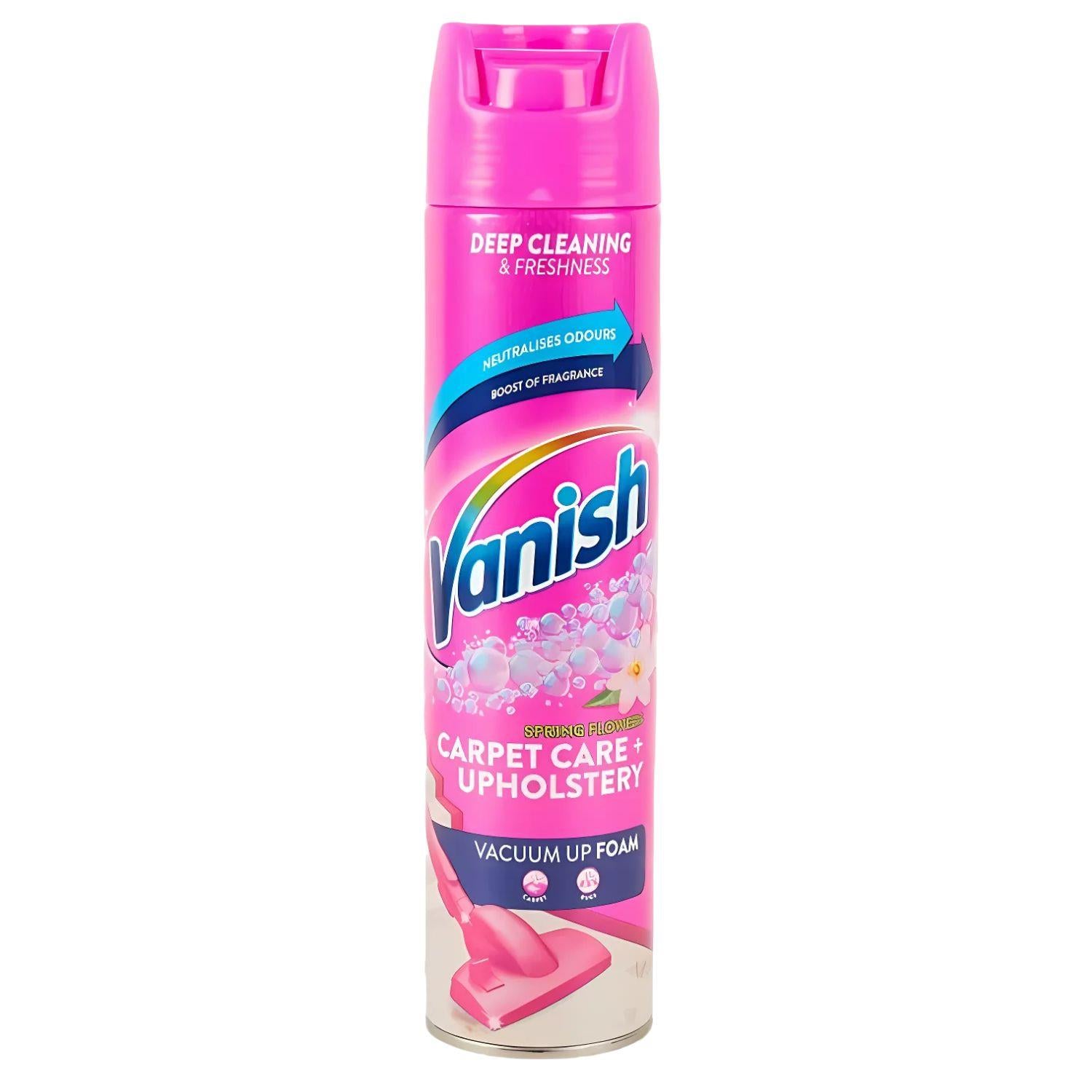 Vanish Carpet Care Upholstery Rug Vacuum Up Foam is specially formulated to clean, refresh, and revitalize carpets, rugs, and upholstery. With its powerful dirt-lifting action and fast-drying formula, it penetrates deep into fibers to remove everyday dirt and grime. Infused with a fresh Spring Flowers Fragrance, it leaves your home smelling clean and inviting while helping to restore the look and softness of your carpeted surfaces.