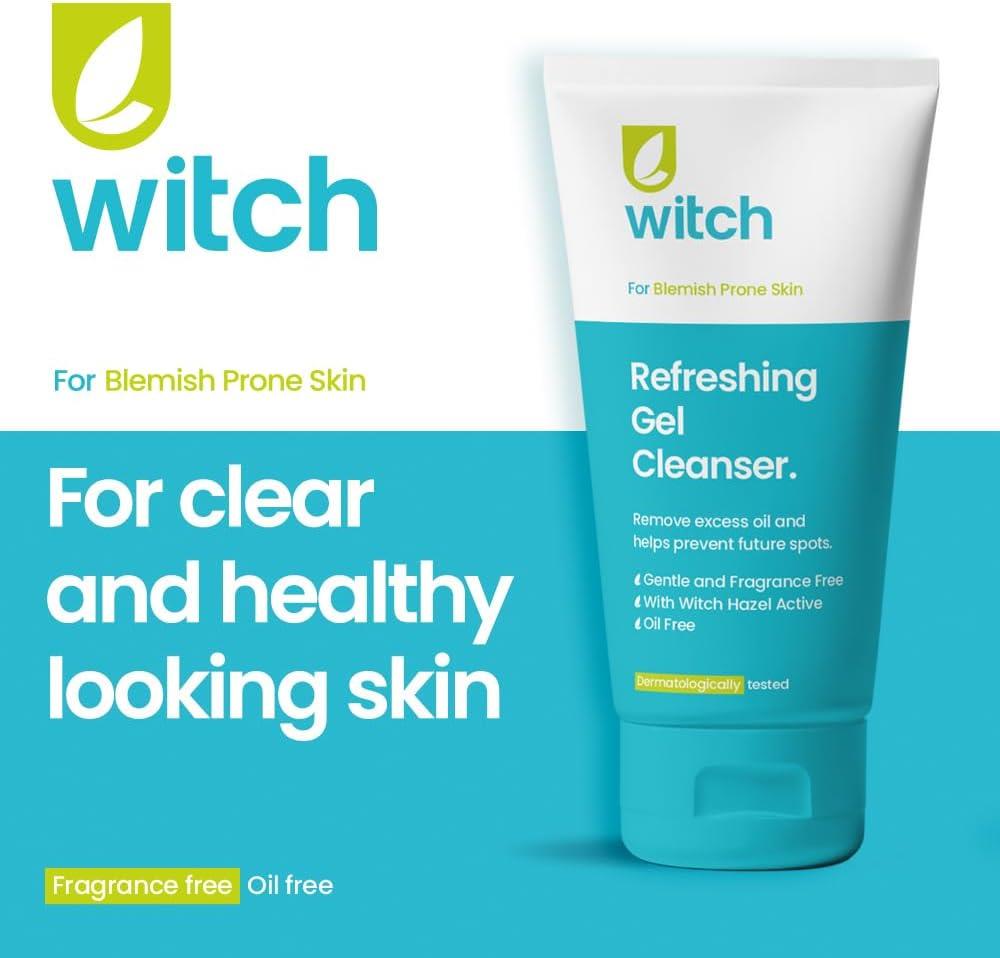 Witch Refreshing Gel Cleanser (150ml) – A lightweight gel face wash with natural astringent Witch Hazel that washes away dirt, oil, and impurities, helping to reduce blemishes while keeping skin hydrated and refreshed. Its fragrance-free, oil-free formula is ideal for sensitive and acne-prone skin.
