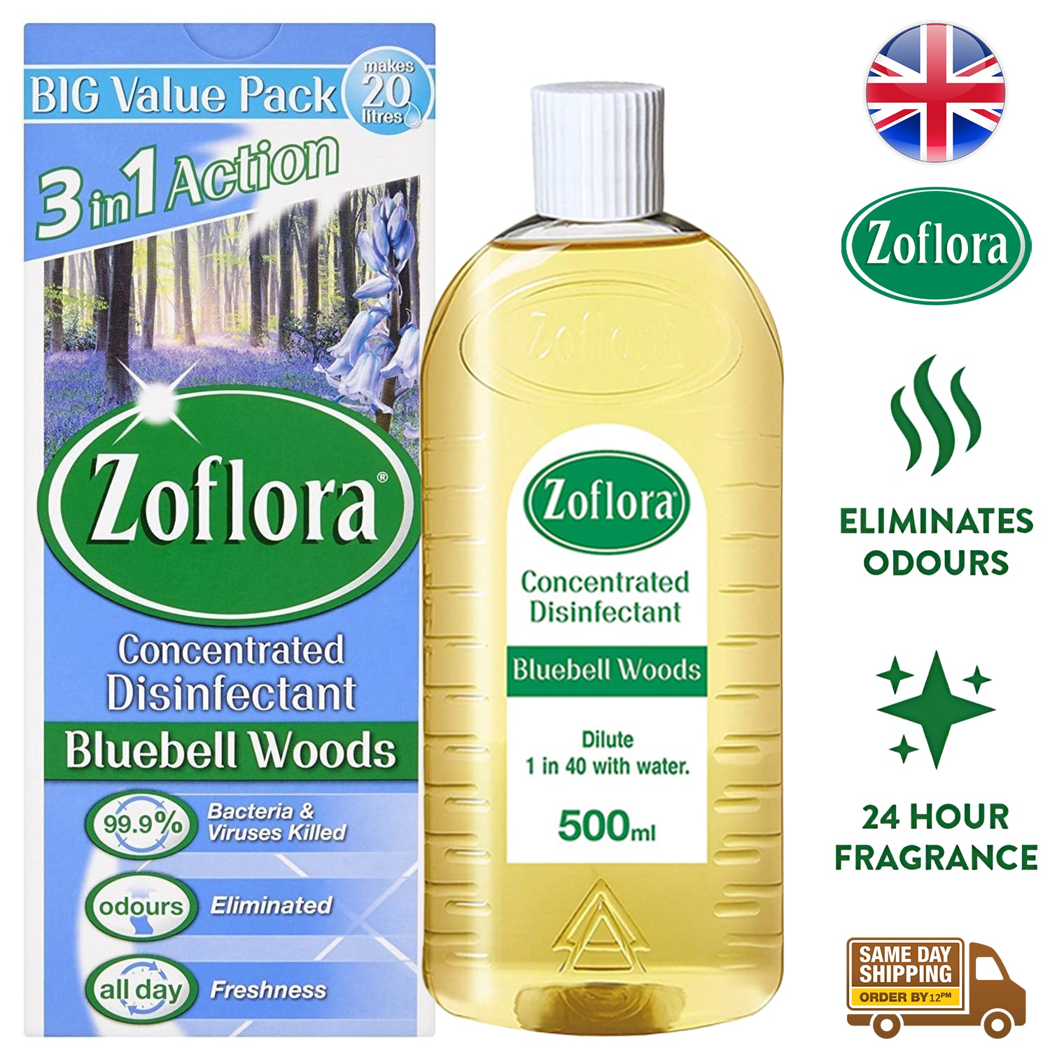 Elevate your cleaning routine with the Zoflora 3 in 1 Concentrated Disinfectant Cleaner in Bluebell Woods. Order now and experience a new level of cleanliness and freshness!